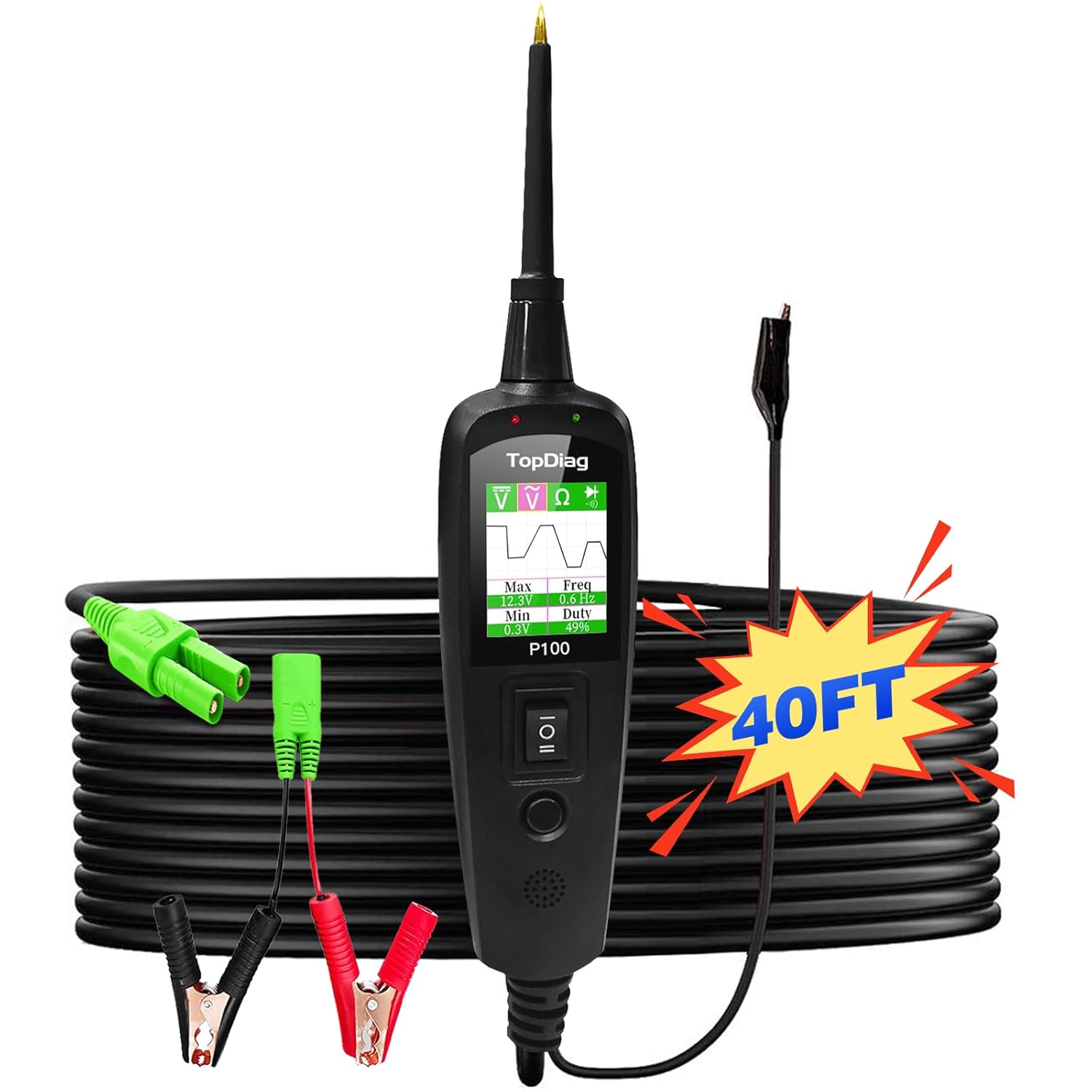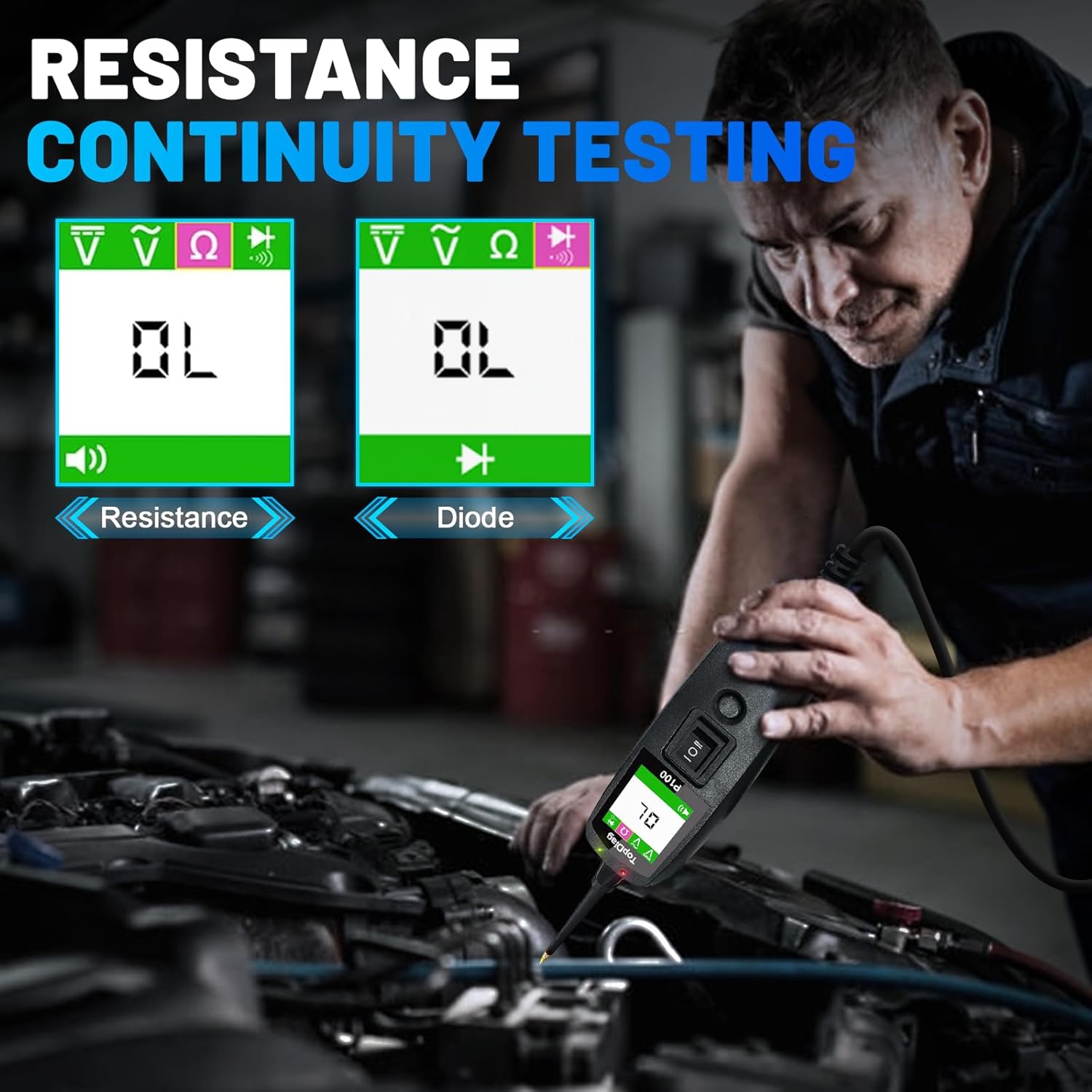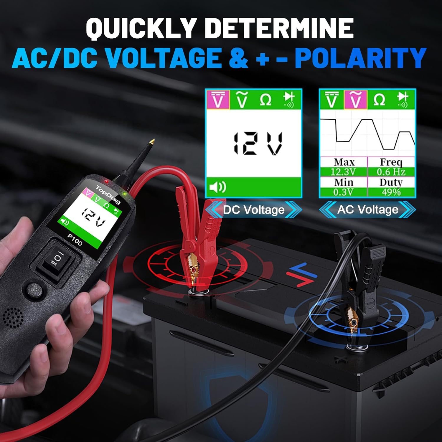 【2024 COST-EFFECTIVE POWER CIRCUIT TESTER KIT】Topdiag P100 Circuit Tester is most accurate power circuit probe tester yet, with 160 x 128 dpi TFT display, it can test all 0-70 volt vehicle electrical systems. It supports Voltage & Polarity Testing, Resistance Continuity Testing, AC Circuit Singal Testing, Components Activation, Testing Trailer Lights and Connections. interface with ergonomic design makes it be best gift for all novice drivers or pro circuit repairers.