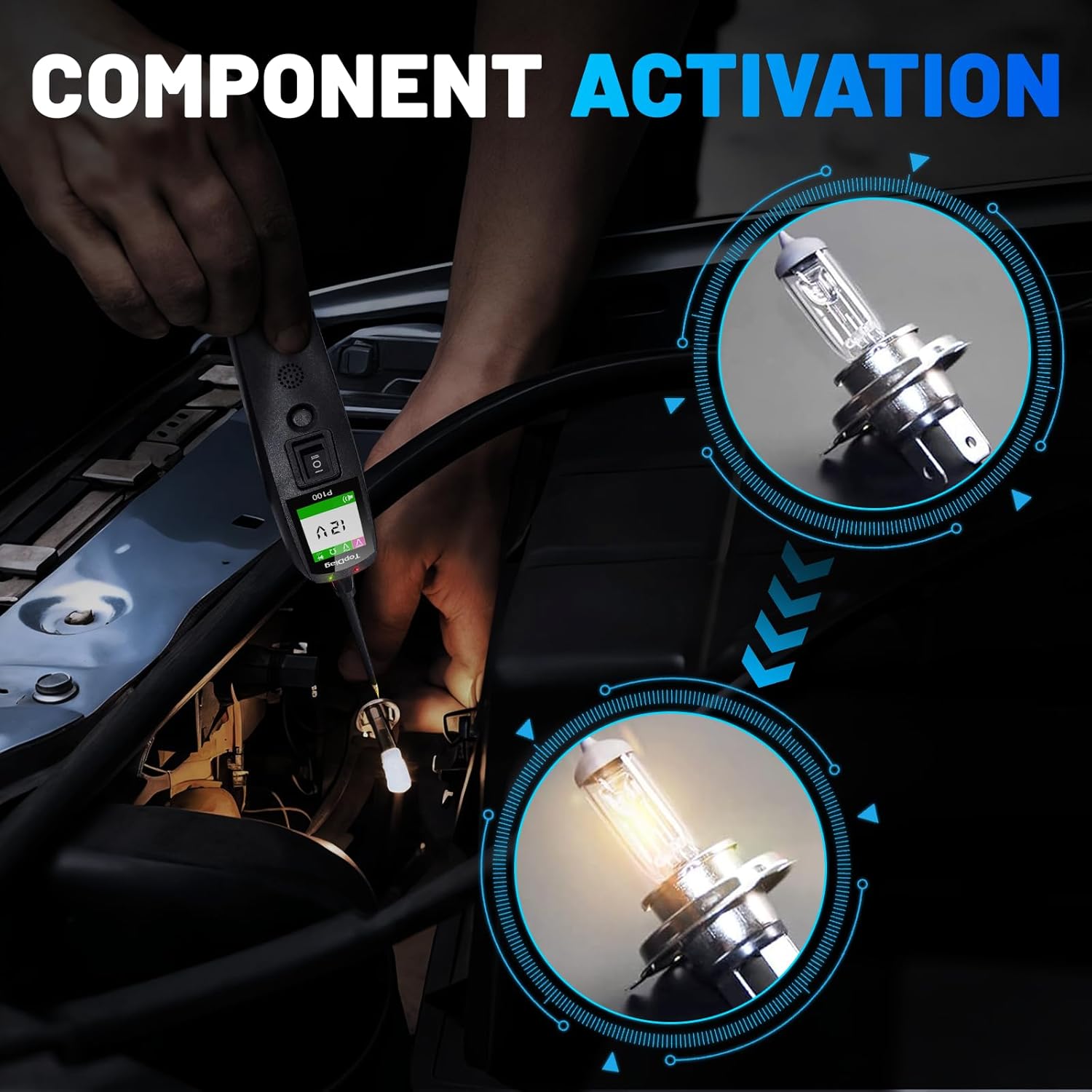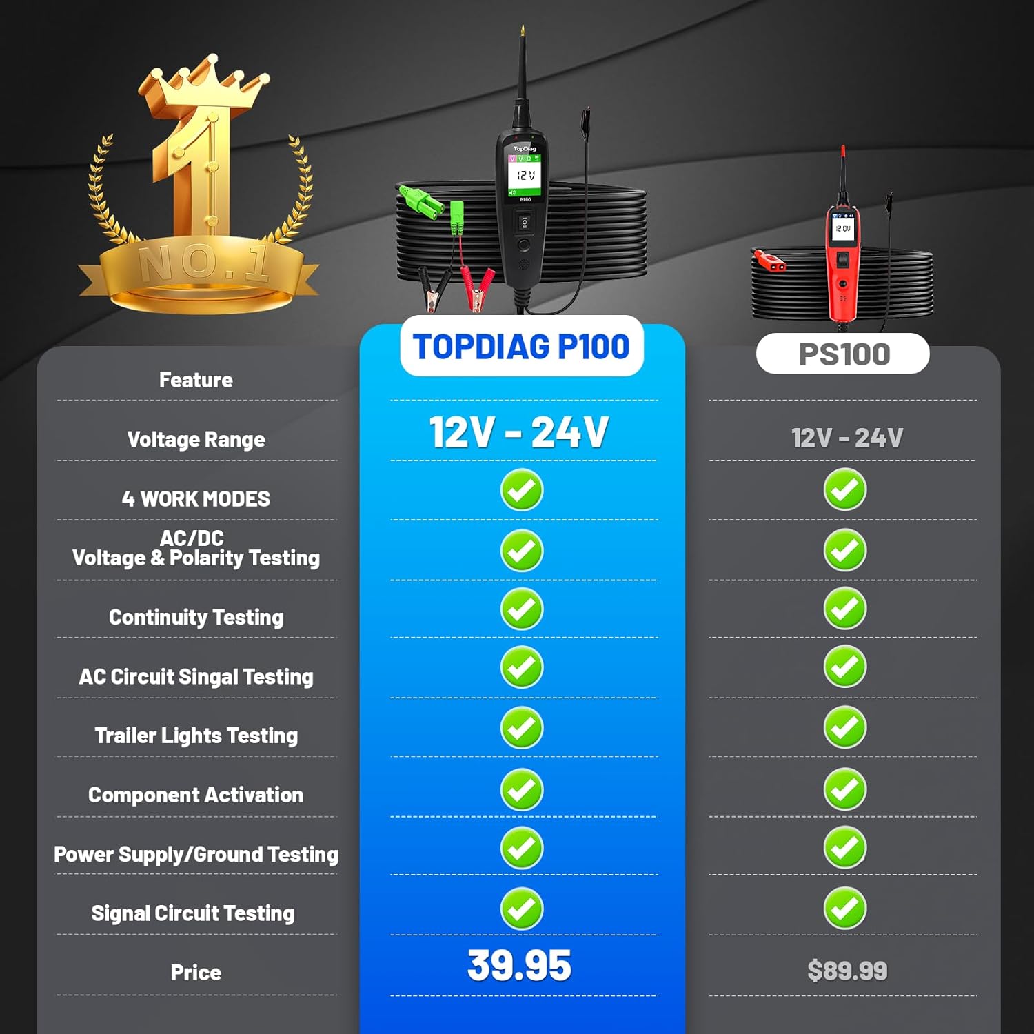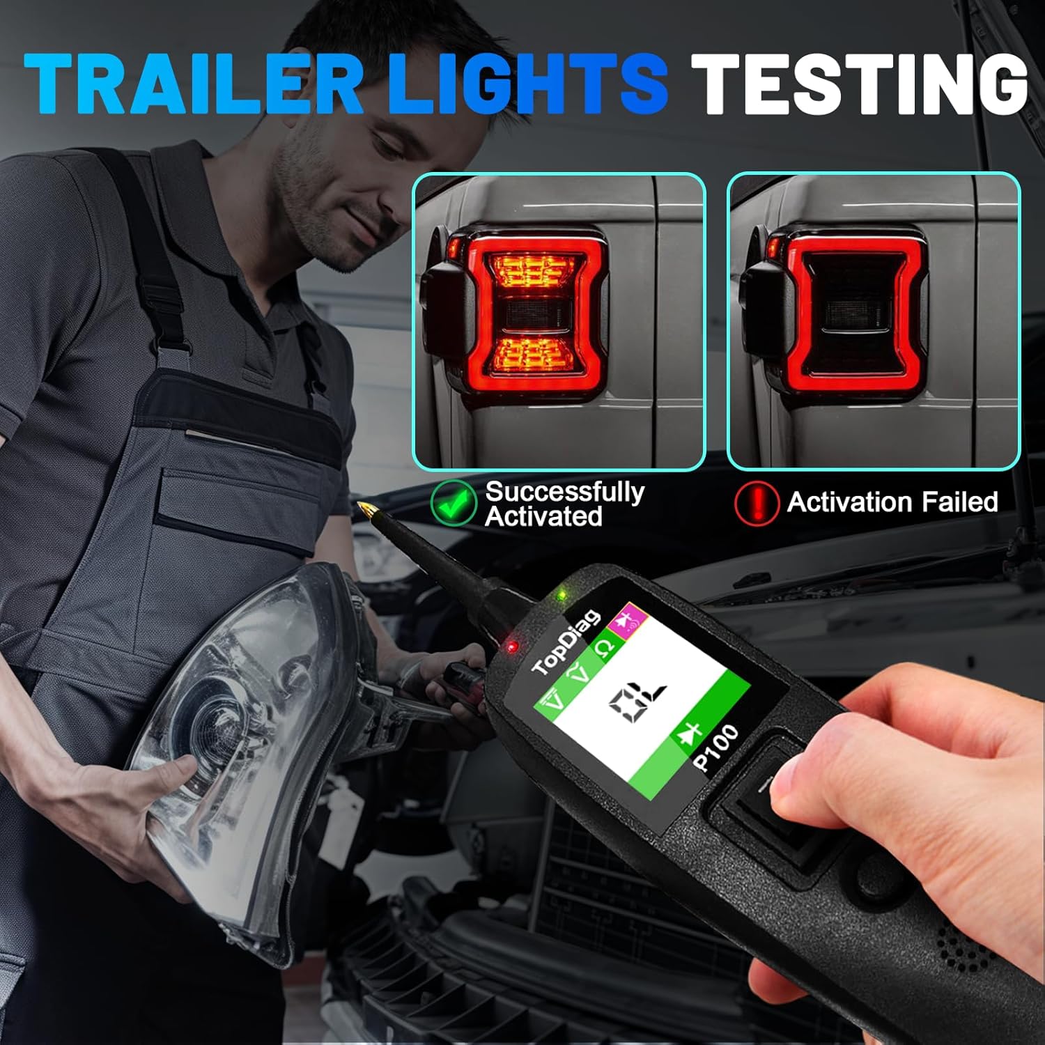 【2024 COST-EFFECTIVE POWER CIRCUIT TESTER KIT】Topdiag P100 Circuit Tester is most accurate power circuit probe tester yet, with 160 x 128 dpi TFT display, it can test all 0-70 volt vehicle electrical systems. It supports Voltage & Polarity Testing, Resistance Continuity Testing, AC Circuit Singal Testing, Components Activation, Testing Trailer Lights and Connections. interface with ergonomic design makes it be best gift for all novice drivers or pro circuit repairers.