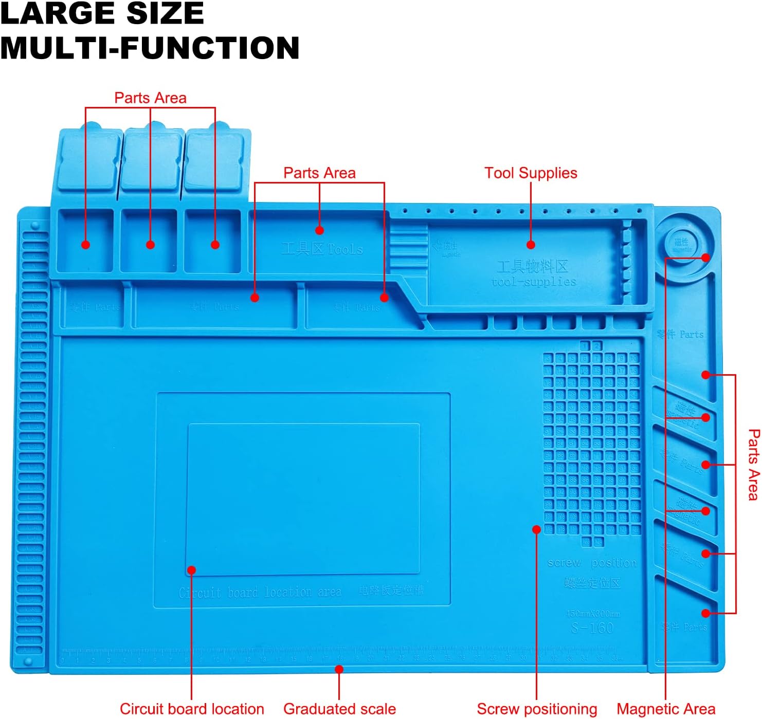 High temperature resistance up to 500 degrees, large working area, 1/3 larger than the traditional padWith motherboard snap area, no need to worry about the motherboard moving when working, while with screw digital positioning grid, easy to summarizeWith magnetic tool compartment, convenient for magnetization of tools and adsorption of parts Screwdriver hole more convenient for your tools storage, selected high-quality silicone, high temperature resistance, no odor Workbench pad with a scale to help you work, while the pad can be rolled up and folded, easy to carry without deformation