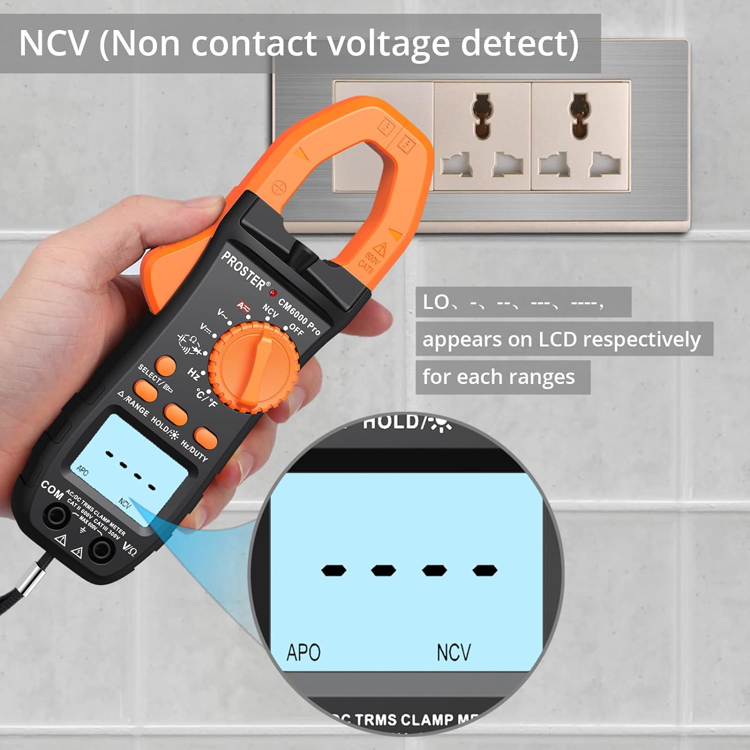 AUTO-RANGING WITH NCV: The meter will automatically select the appropriate auto range; NCV detects the existence of AC voltage on conductors and cables in-wall, troubleshooting electrical problems in a safe way
