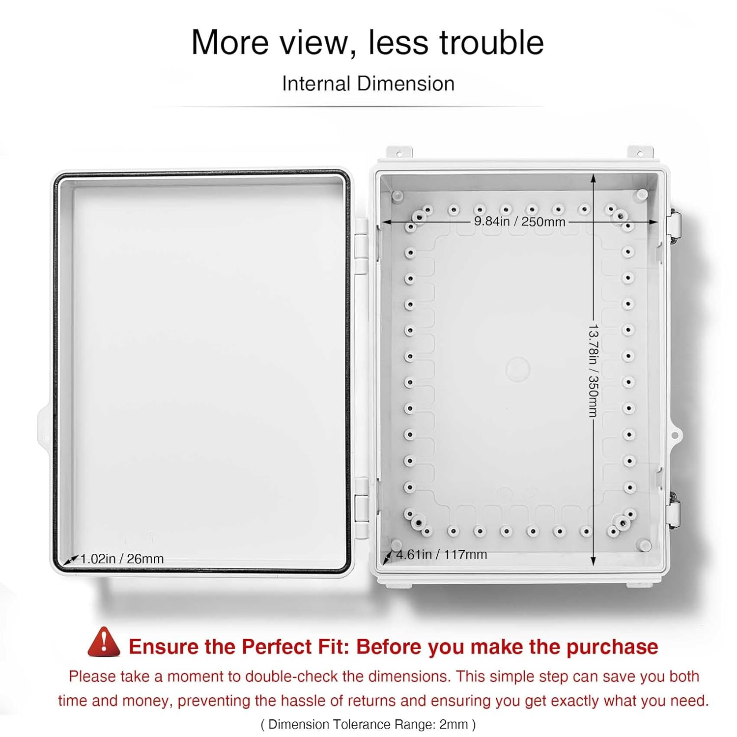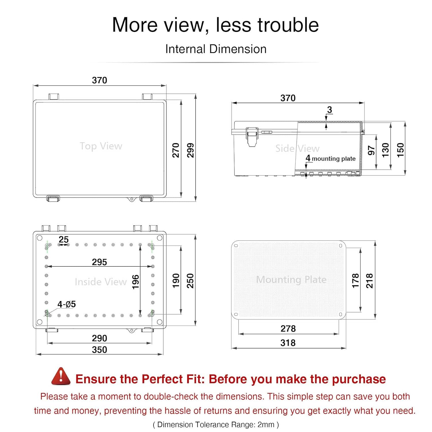 【DIMENSIONS】- The EXTERNAL size is 14.6″x10.6″x5.9″ (370x270x150mm) for the weatherproof box. The INTERNAL size can be found in the dimension drawing. Ensure a perfect fit: Please double-check dimensions before purchasing to ensure a seamless match that saves you time and costs. If you have any doubts about the dimensions, please don’t hesitate to contact us.