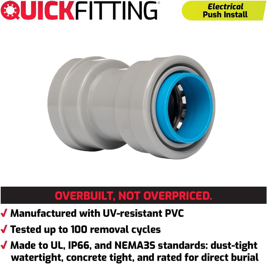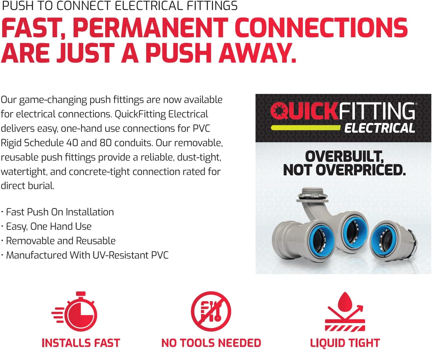 PUSH INSTALL CONDUIT COUPLING; QuickFitting Electrical connectors are designed with ease of use in mind; they deliver fast, clean, and easy, one-hand connections for PVC Rigid Schedule 40 and 80 conduits backed by our 5-year warranty