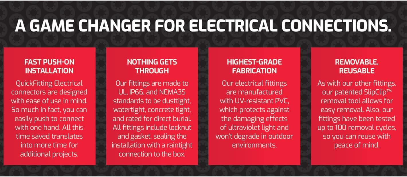 WHY CHOOSE QUICKFITTING; QuickFitting Electrical push install technology features a secure connection, all while giving the user full control through our patented Slip Clip release tool; Our electrical fittings are reusable, durable, and a long-lasting solution