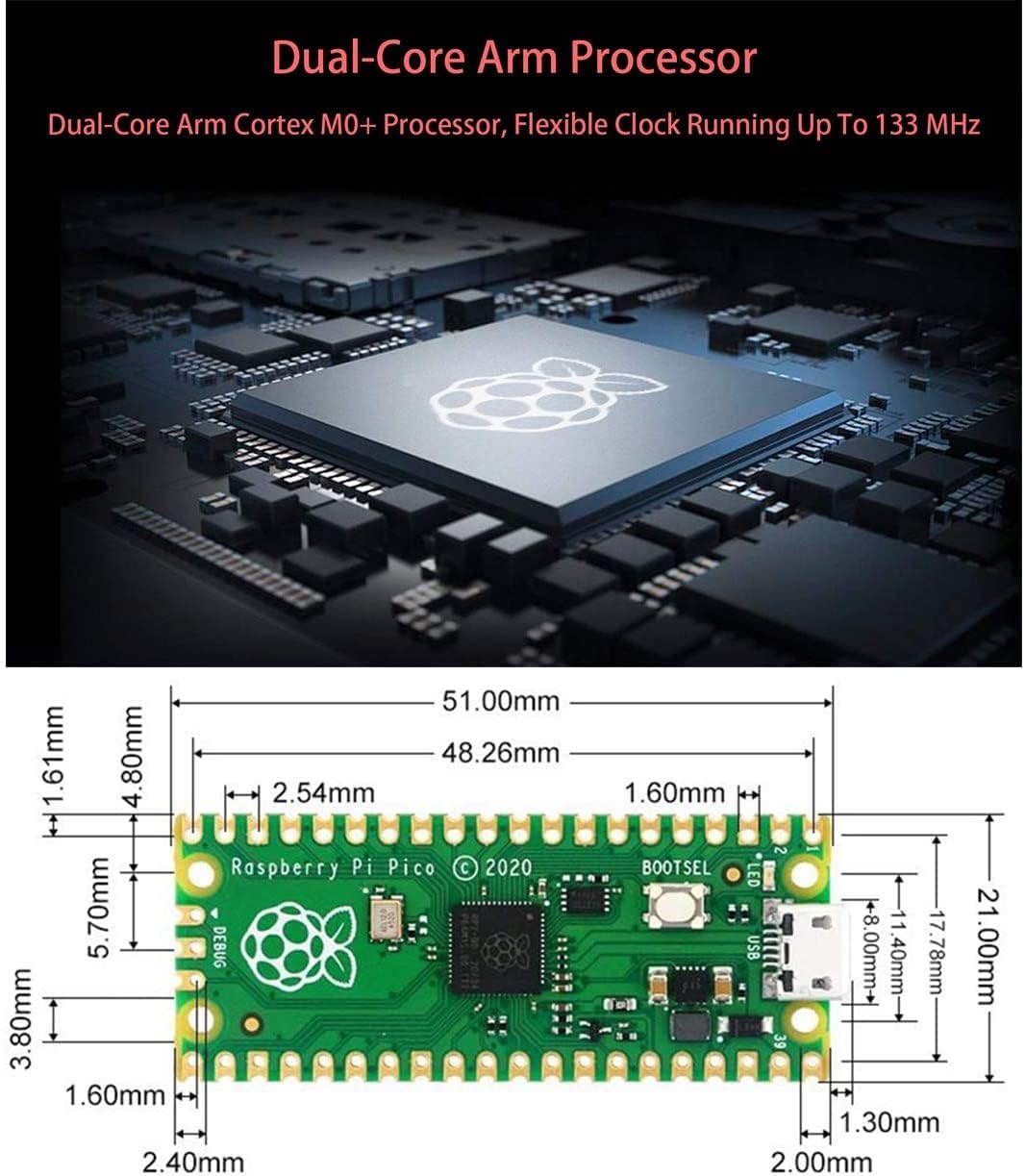 [Powerful] RP2040 features a dual-core Arm Cortex-M0+ processor with 264kB internal RAM and support for up to 16MB of off-chip flash. A wide range of flexible I/O options includes I2C, SPI, and – uniquely – Programmable I/O (PIO).