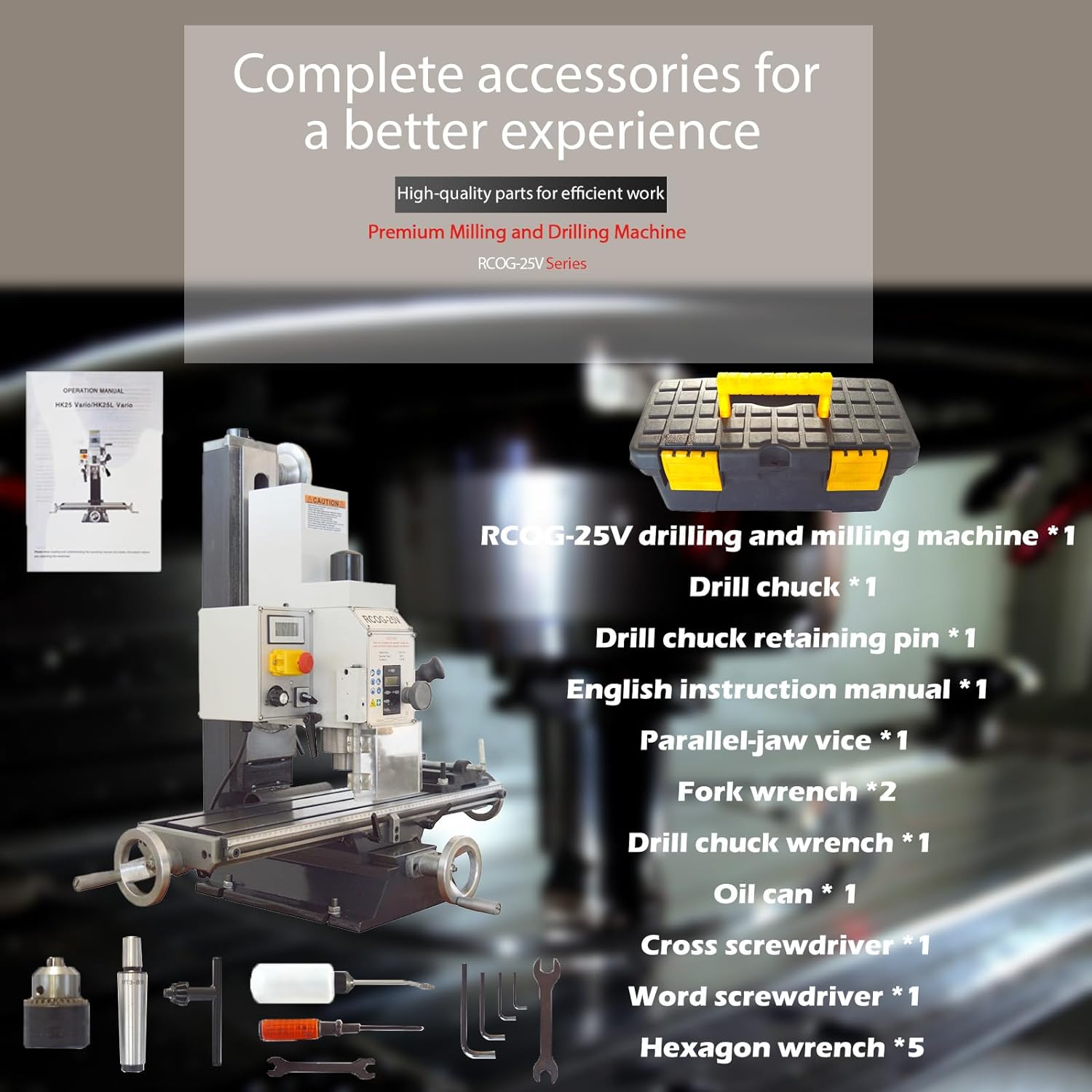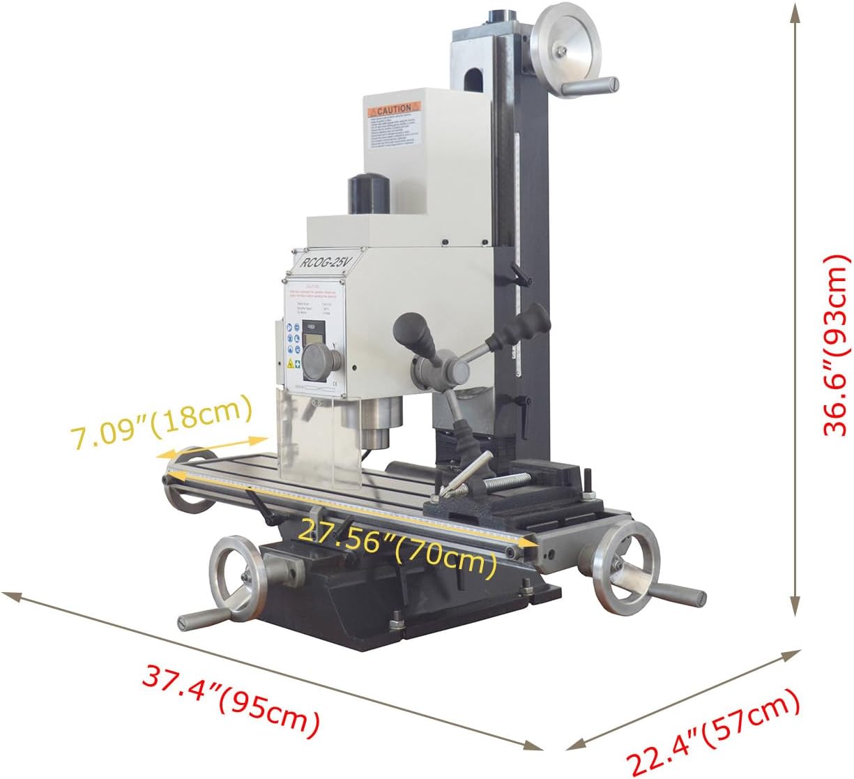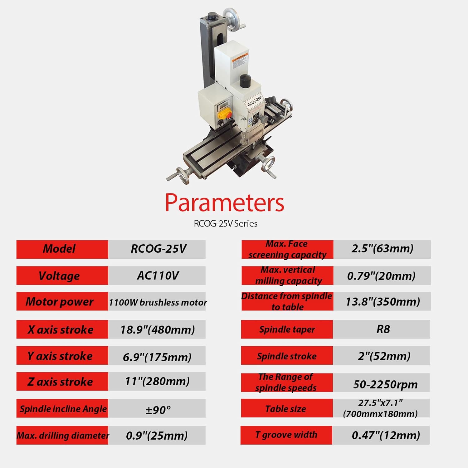 RCOG-25V 1100W Mini Precision Drilling and Milling Machine Benchtop Drilling and Milling Machine with R8 Spindle Taper and Brushless Motor 110V