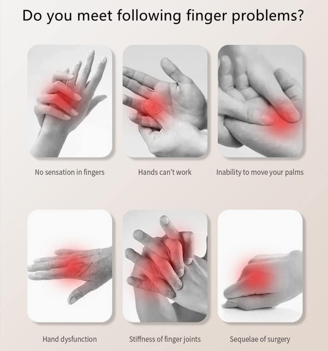 Particular Finger Training—The back of each finger corresponds to an independent air valve. Air pressure can be turned off to a particular finger by the white valves. It easy to isolate a particular finger or fingers for training. Meeting different traning and promotes finger flexibility while rebuilding strength.