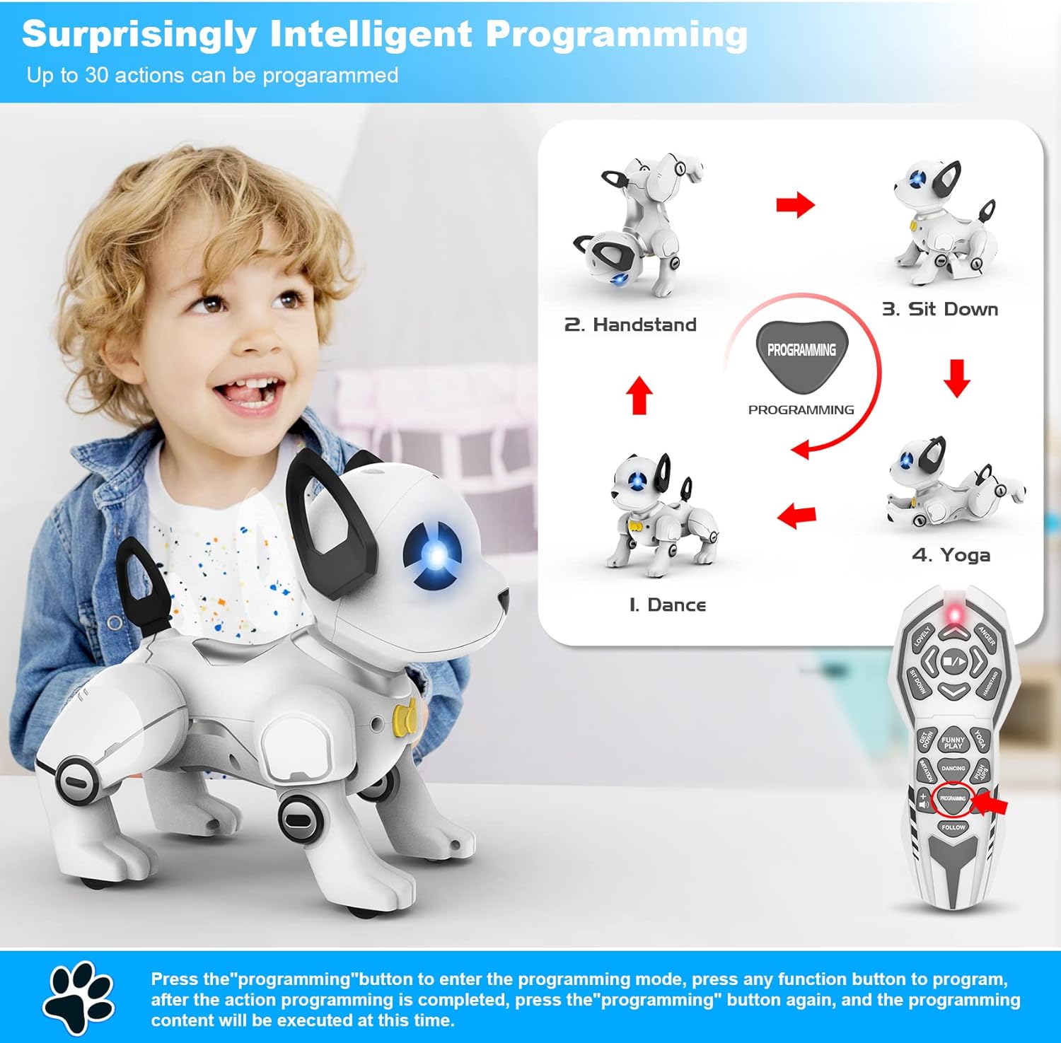 【Intelligent Programmable RC Toy Dog】12 functions remote control directives, you also can program the Robot dog to perform according to your demands, then the dog will repeat what you programmed. Follow, Imitate, Dancing, Yoga, Move Forward, Handstand, Push-ups, Sit down, Crouch Down, Wrath, bark Adjust Volume, etc. The smart dog will record up to 100 commands, It will help your kids use their imagination and creativity to practice simply programming.