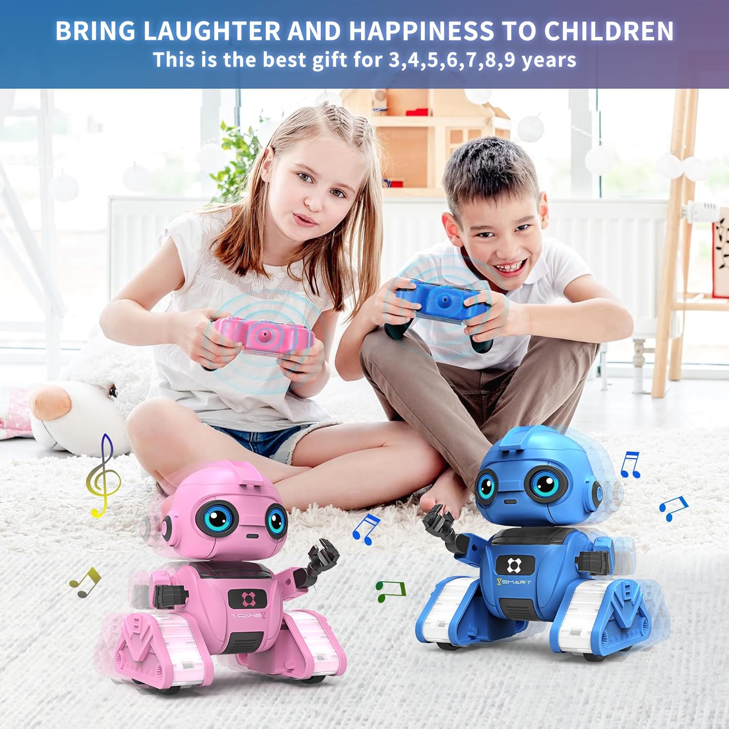MULTI-FUNCTIONAL ROBOT TOY: Outfitted with LED eyes,The controller can switch between different LED eye colors; it can sing and dance, with a variety of songs to switch between.Powerful LED tank track wheels, it moves flexibly in any direction—forward, backward, left, and right. In automatic demonstration mode, it performs 360-degree spins and dances with agile arms and heads. Gesture sensing and 2.4 GHz interference-free controller, Enhances interactive fun for children.