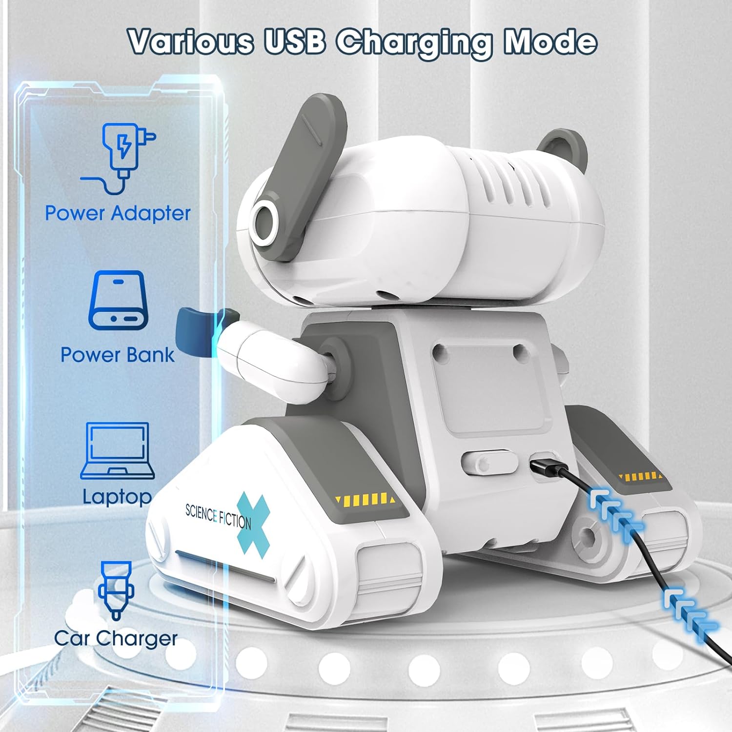 đ€ăFantastic Unique Appearanceă: This cute robot toy is designed in 3 parts. The upper part has shiny LED eyes and flexible arms/ head. Switch the Smart Voice mode, the kids robot toy will start talking and singing different songs; The bottom part is tank tracks, which allow the robot to left and right, and rotate 360° in place. Under demo mode, it will begin 360-degree spins, move and dance with the music, allowing your child to enjoy a more enjoyable playing experience.