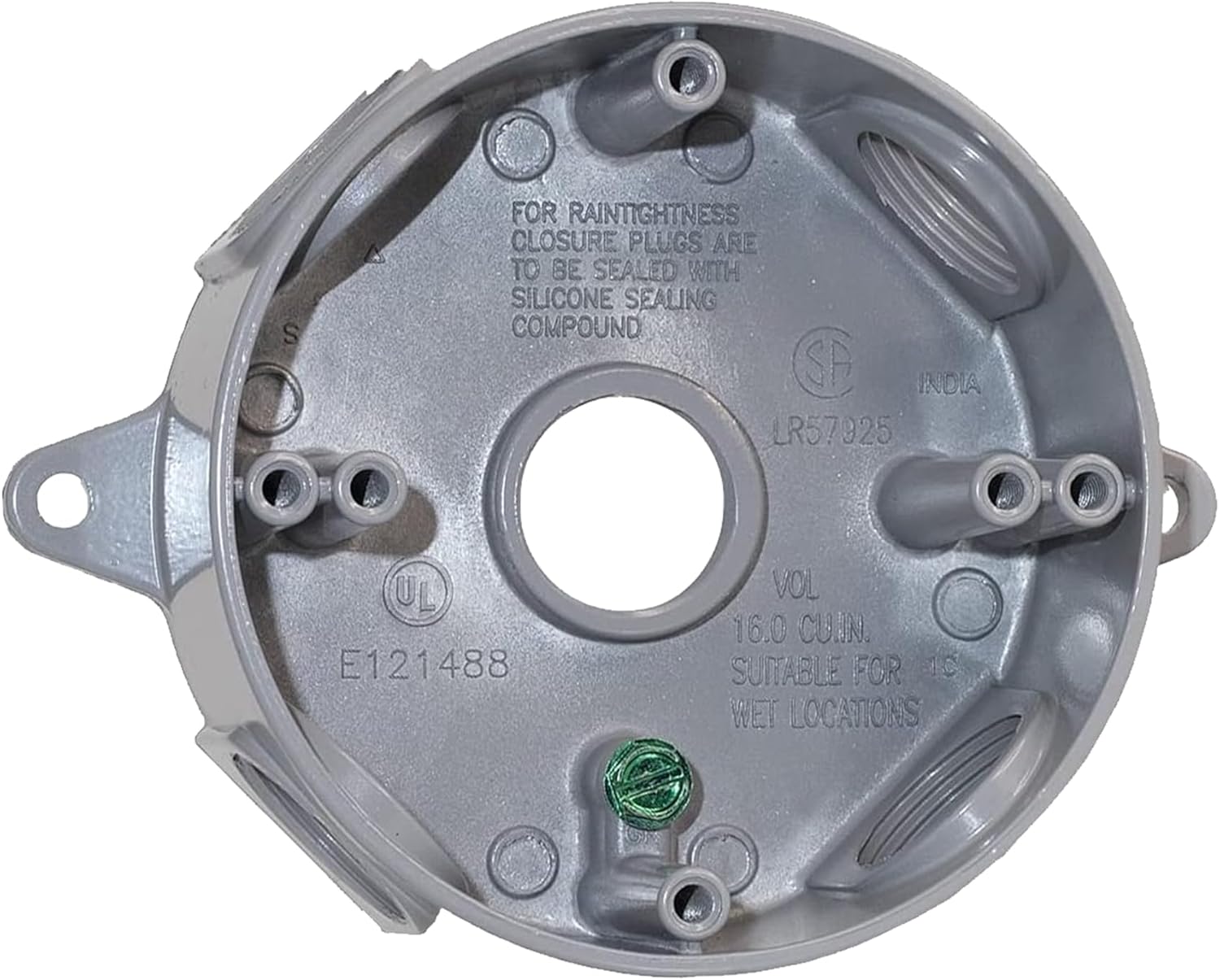 Die-cast construction and powder coated for corrosion resistance and includes a pre-installed ground screw and closure plugs