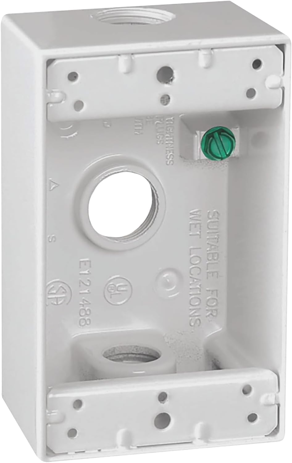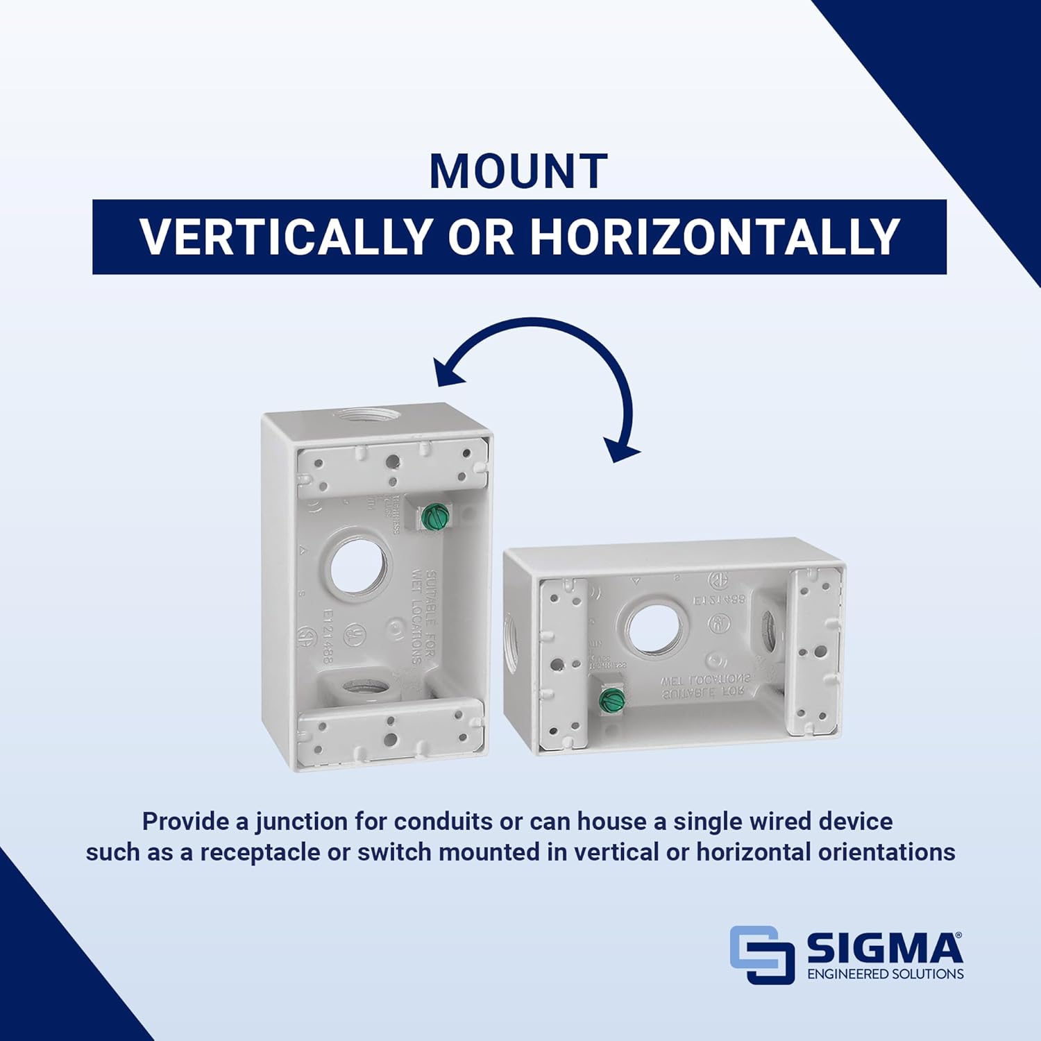 Sigma Engineered Solutions weatherproof one-gang junction box provides a place for conduit, receptacle or switch that is single-wired. The rugged, die-cast construction prevents moisture penetration making the box suitable for wet, damp or dry locations. The box is powder coated for corrosion resistance and features a ground screw for secure installation. Boxes include hardware, closure plugs and pre-installed ground screw. Product is UL and CSA listed.
