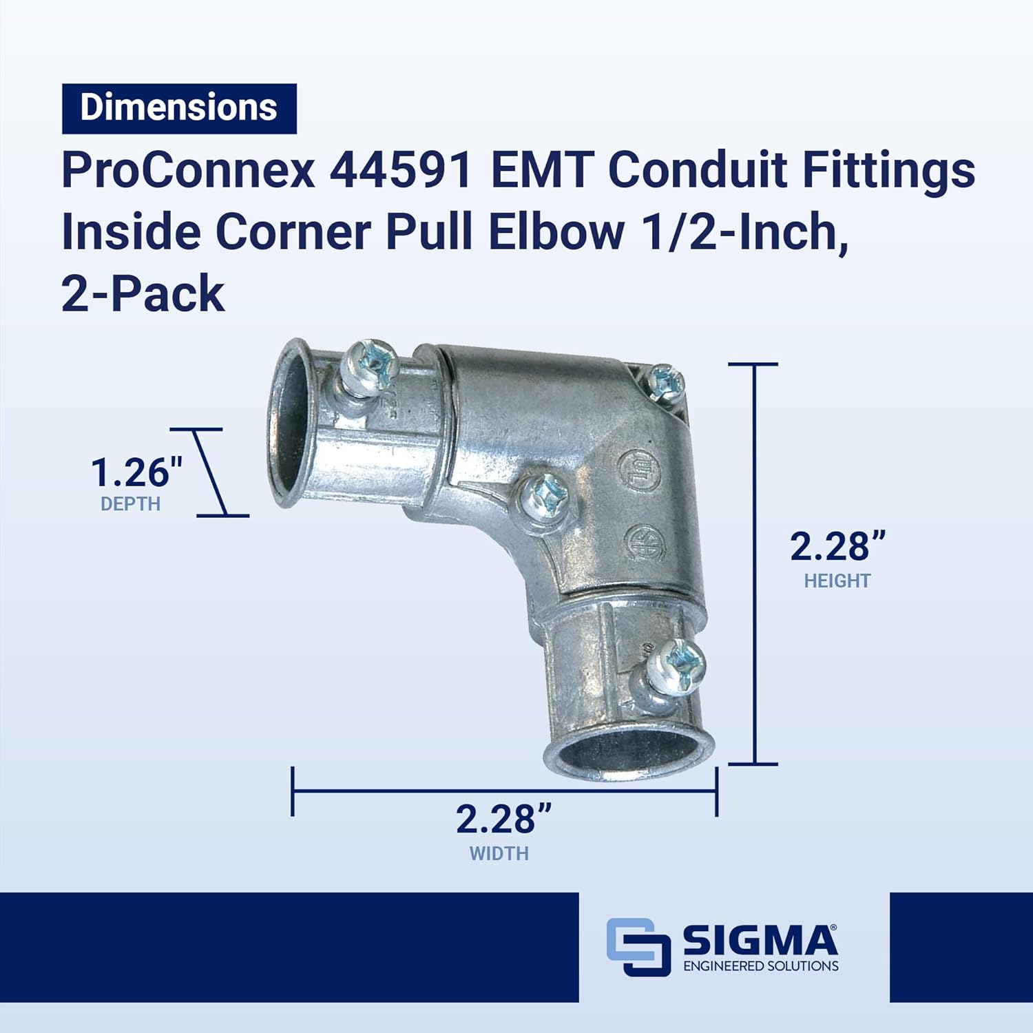 Elevate your electrical installations with the Sigma Engineered Solutions ProConnex 44591 EMT Conduit Fittings Inside Corner Pull Elbow 1/2-Inch, a reliable solution for your electrical conduit connections. This 2-pack of inside corner pull elbows seamlessly connects two lengths of 1/2-inch EMT conduit at a precise 90-degree angle, making it perfect for navigating tight turns in areas with limited space. The set screw type design with a removable cover ensures secure installation while allowing for easy adjustments or modifications as needed. These fittings are approved for concrete-tight applications when properly taped, providing added reliability and safety. Crafted from durable zinc die-cast construction, these pull elbows guarantee long-lasting performance and dependable functionality for your electrical projects.