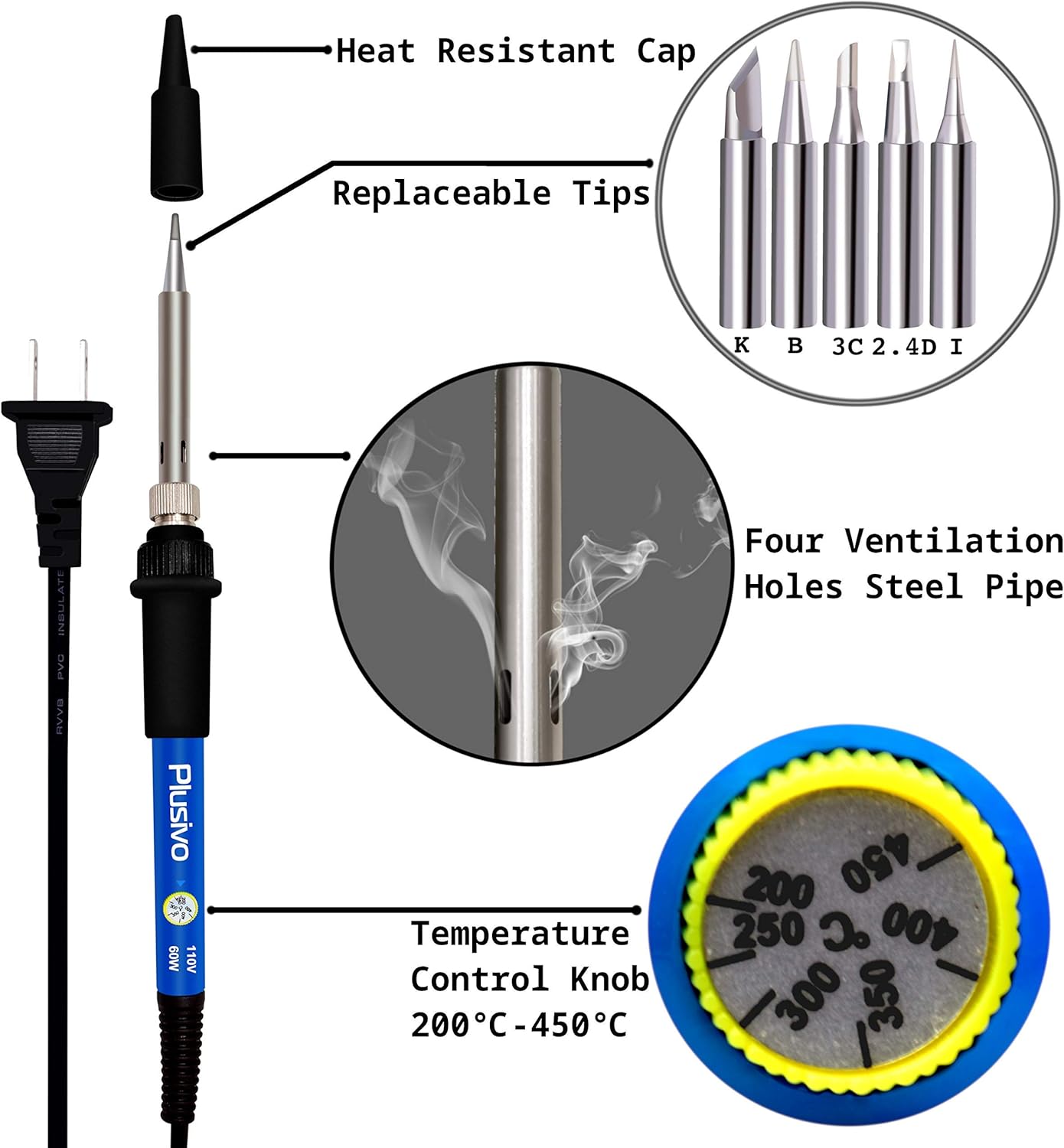 Premium quality: 60W 110V soldering iron with adjustable temperature (392 ℉-842 ℉/200-450 ℃), high-performance ceramic heating element, 5 good quality replaceable tips, heat-resistant silicone grip for maximum comfort and reduce slippage