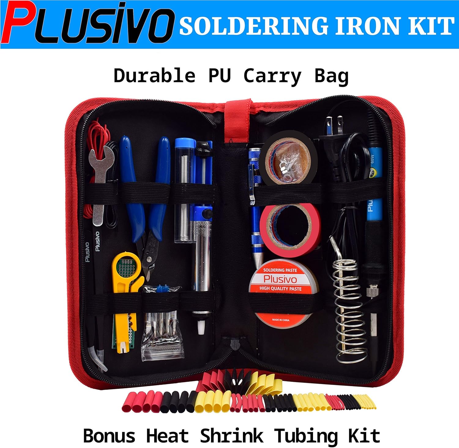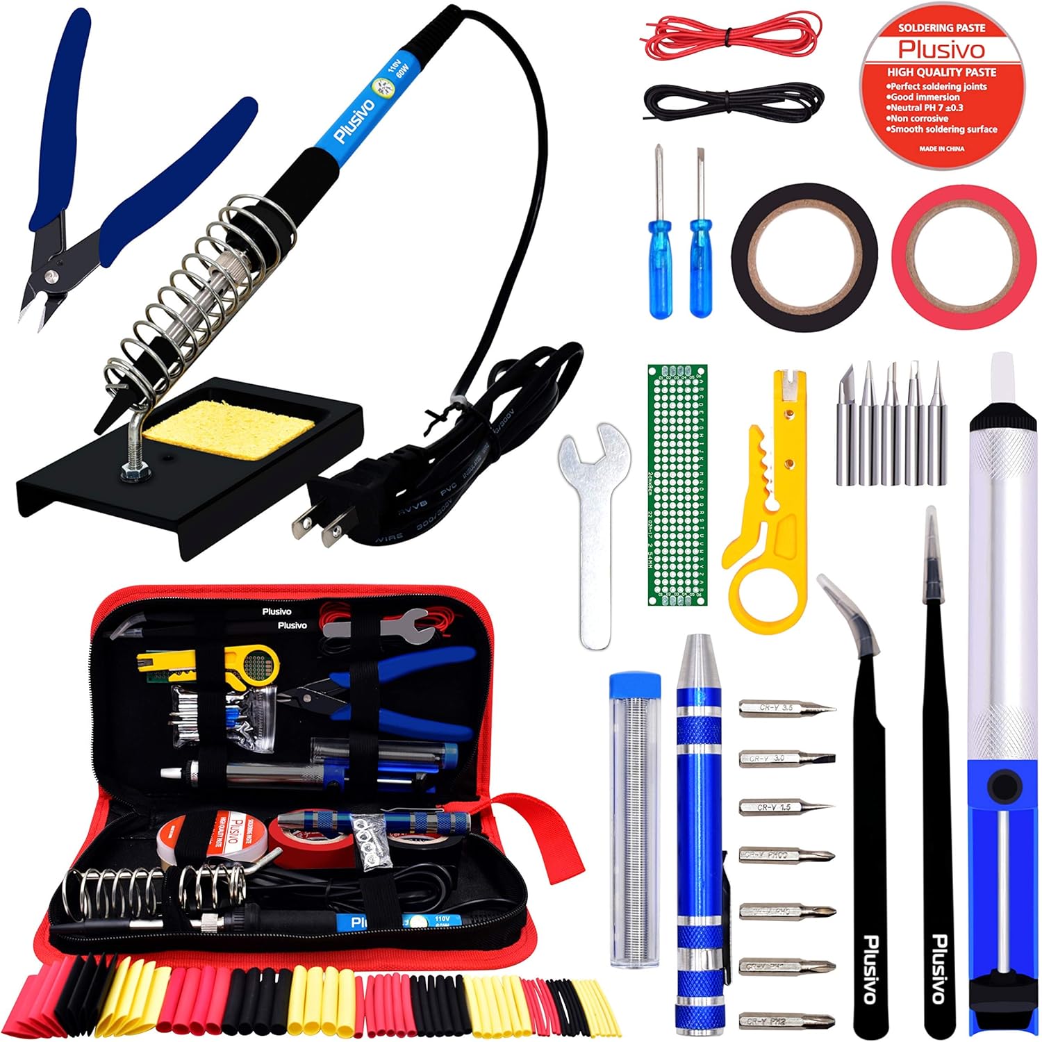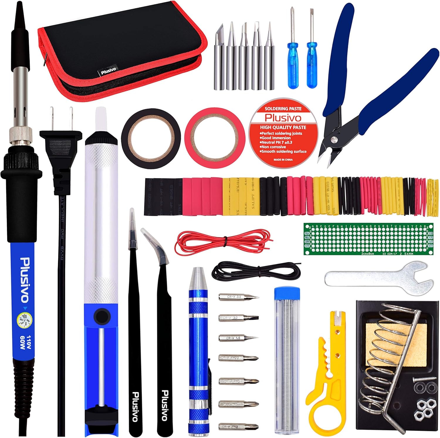 1pc Adjustable Temperature Soldering Iron (60 W)1pc Soldering Iron Stand1pc Diagonal Wire Cutter and 1pc Mini Wire Stripper Tool2pcs Tweezers (Curved ESD-15, Straight Tweezers ESD-11)1pc Tin Wire Solder Tube (10 grams)1pc Desoldering Pump2pcs Wires (22AWG Black and Red Wires)5pcs Soldering Iron Tip Set1pc Soldering Paste1pc Mini Screwdriver and 1pc Mini PCB2pcs Insulating Tapes (black and red)1pc Pen Shaped Screwdriver (with 7 magnetic bits) 1pc Heat Shrink Kit1pc Plusivo flyer (contains instructions on how to download the Ebook)