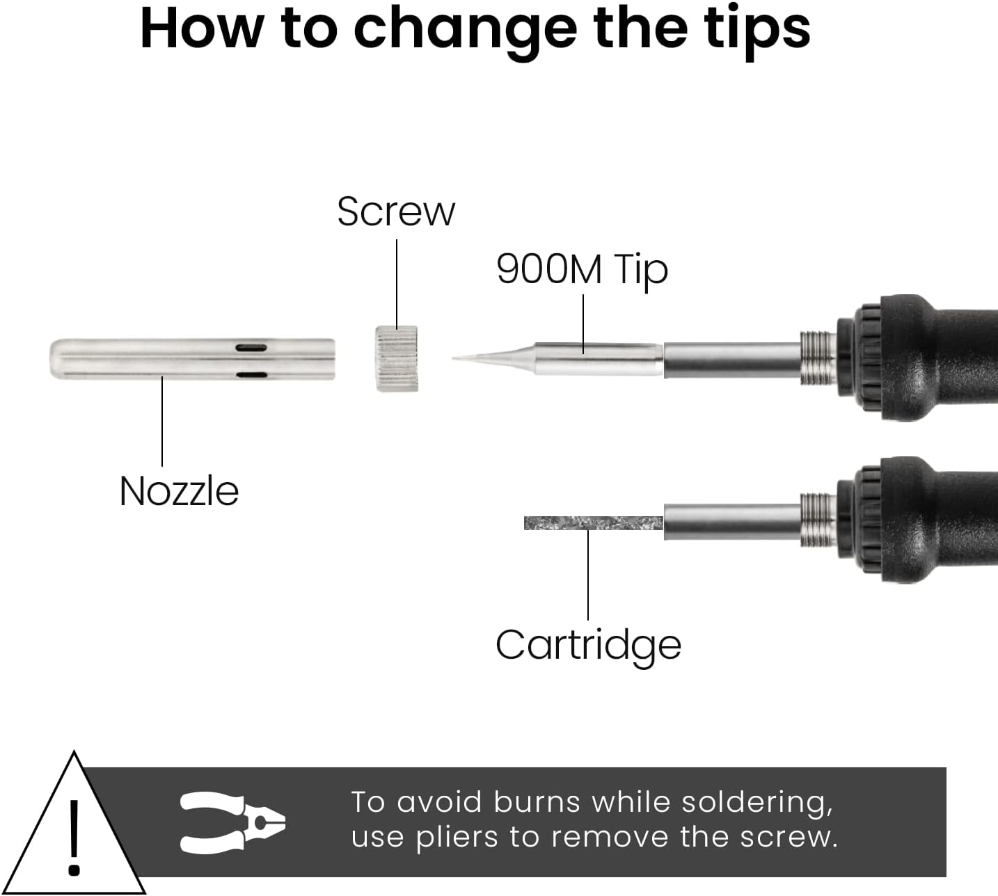 Please always be careful when using these tools, check the safety tips when working with soldering iron and related activities.Please select a suitable temperature when solderingLower down the temp or turn off the soldering iron when not to be used for longer periods of time (do not let it be idle) to avoid damage to the iron and tipsIf something unusual happens with the product and if you are not familiar in fixing it, unplug it and do not do anything and contact seller for assistance