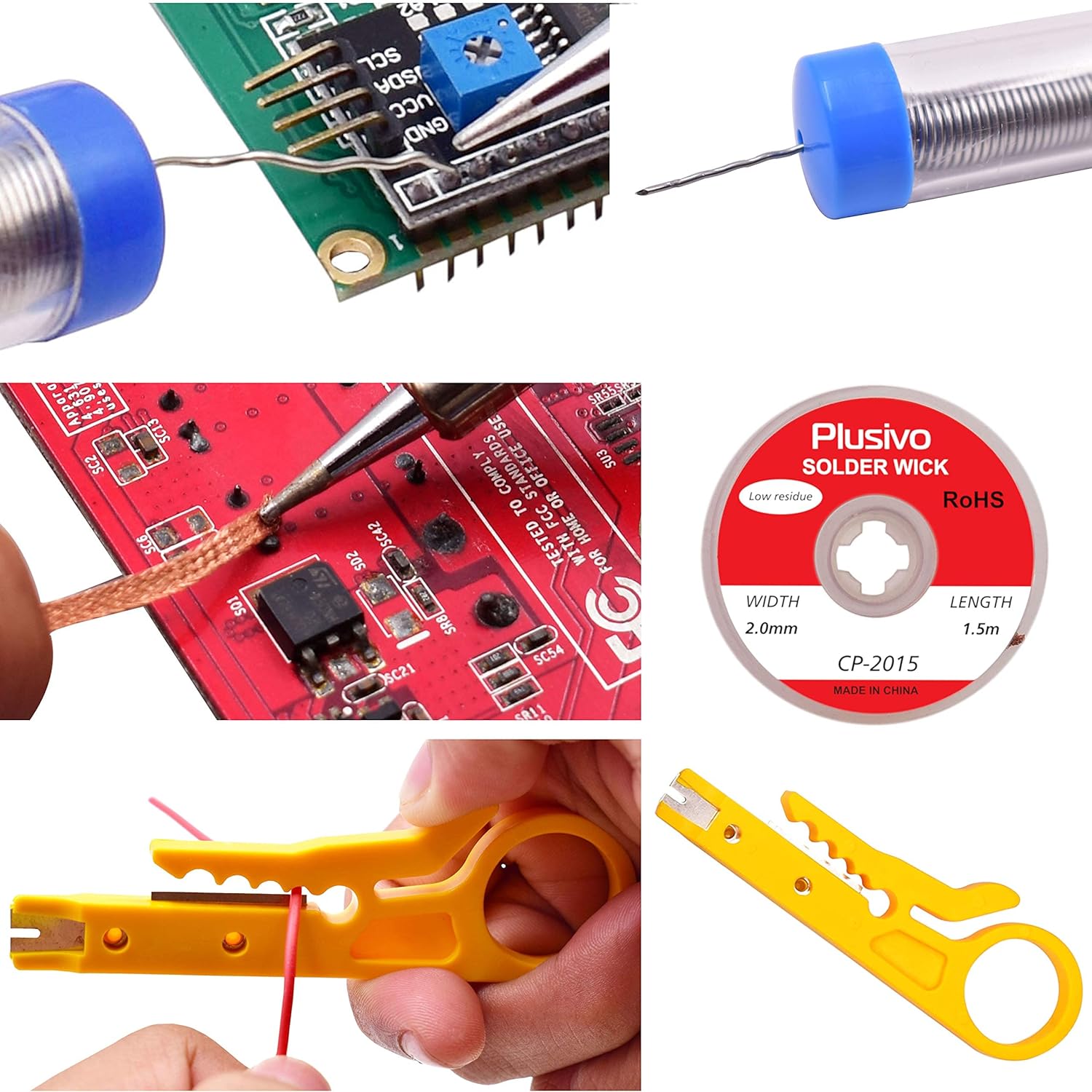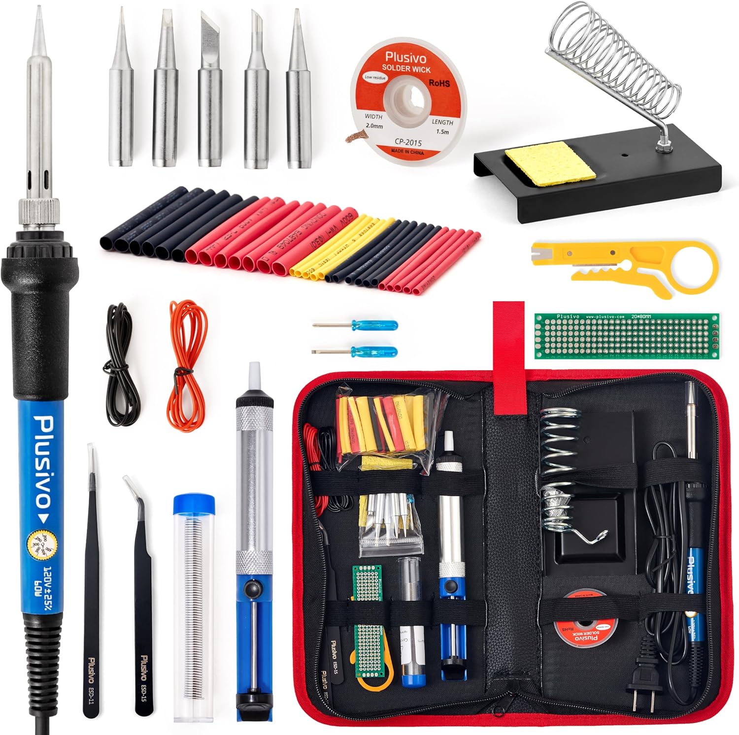 21-in-1 set: The Plusivo Soldering Kit is a full set of soldering tools for hobbyists, electronics and electrical learners, enthusiasts, beginners, and professionals. It is suited for purposes such as DIY soldering projects, electronics repairs, home crafts-making, and many more.Safety feature 1: Included in the kit is a soldering iron stand equipped with a spring holder that holds the soldering iron perfectly, and a cleaning sponge to keep the tips free from excess solder.Safety feature 2:The soldering iron has heat-resistant anti-skid handle to protect users from burns and it also comes with five replacement tips.More items: With tin wire solder tube, desoldering pump, and mini PCB, among others needed for soldering or desoldering. It also comes with solder wick/braid, straight and curved tweezers, wire stripper, mini screwdrivers, mini wrench, 22AWG wires and heat shrink tubings.Durable Carry Bag: The tools come handy in a durable PU carry bag that keeps all the components organized and is easy to carry.Download the E-book – Mastering the Art of Soldering that contains all the necessary information about the included tools and materials plus several How To’s, Do’s and Dont’s, and many other topics on soldering.