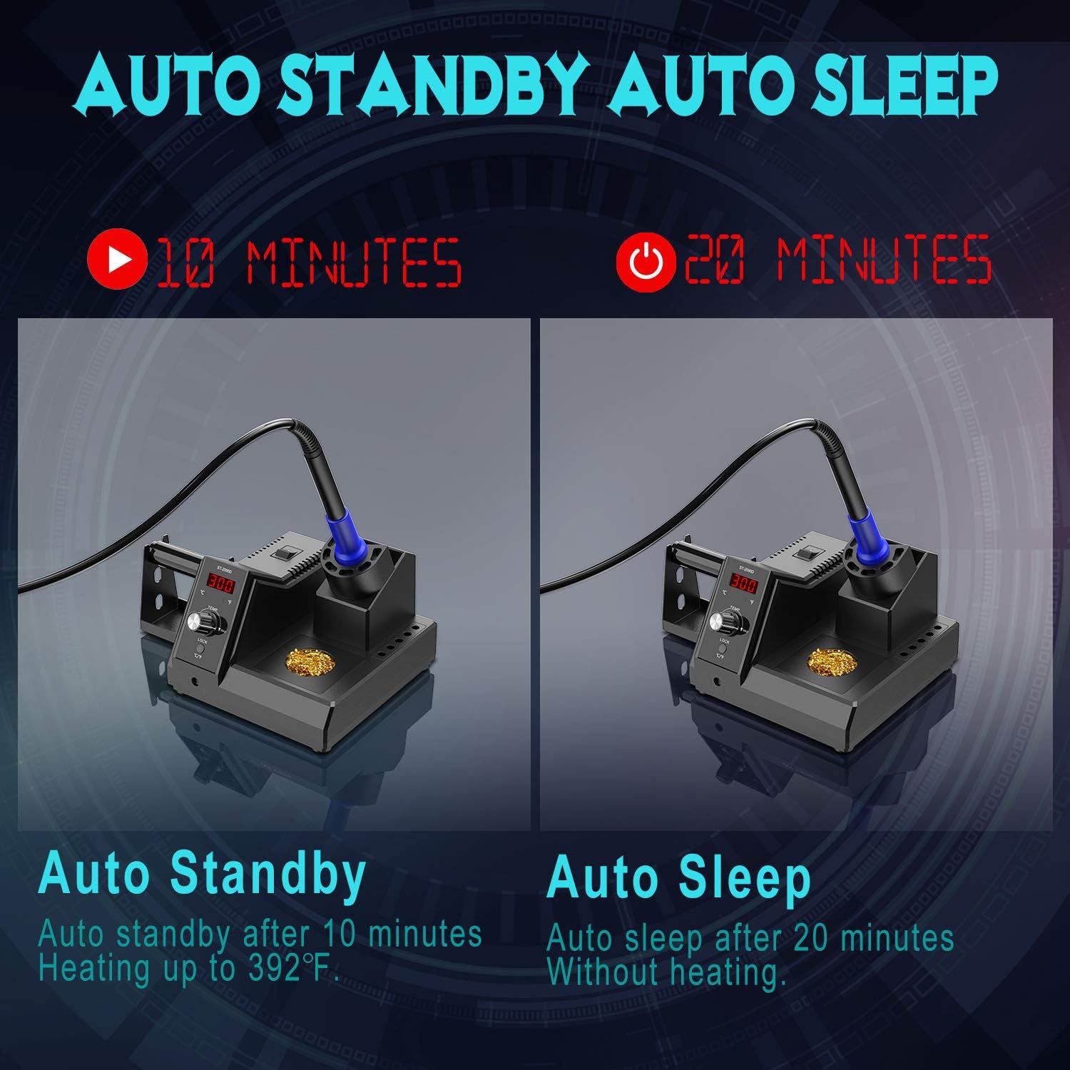 When the solder station does not operate for 10 minutes, it will standby, and it will sleep when it is over 20 minutes. This feature not only saves power, but also ensures your safety in use.