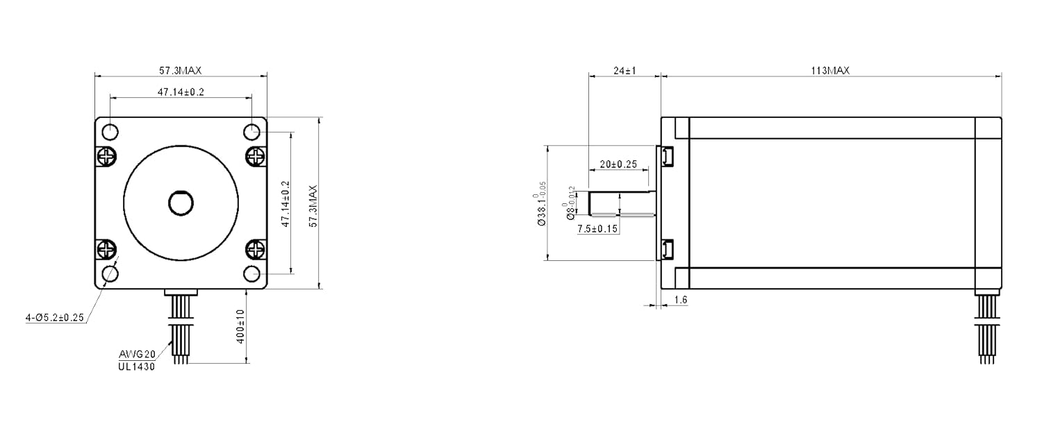 This is the strongest Nema 23 stepper cnc motors, it with step angle 1.8deg and size 57x57x113mm. It has 4 wires, each phase draws 4.2A, with holding torque 3.0Nm(425oz.in).Different from standard 10mm shaft diameter, the shaft diameter of this motor is 8mm.