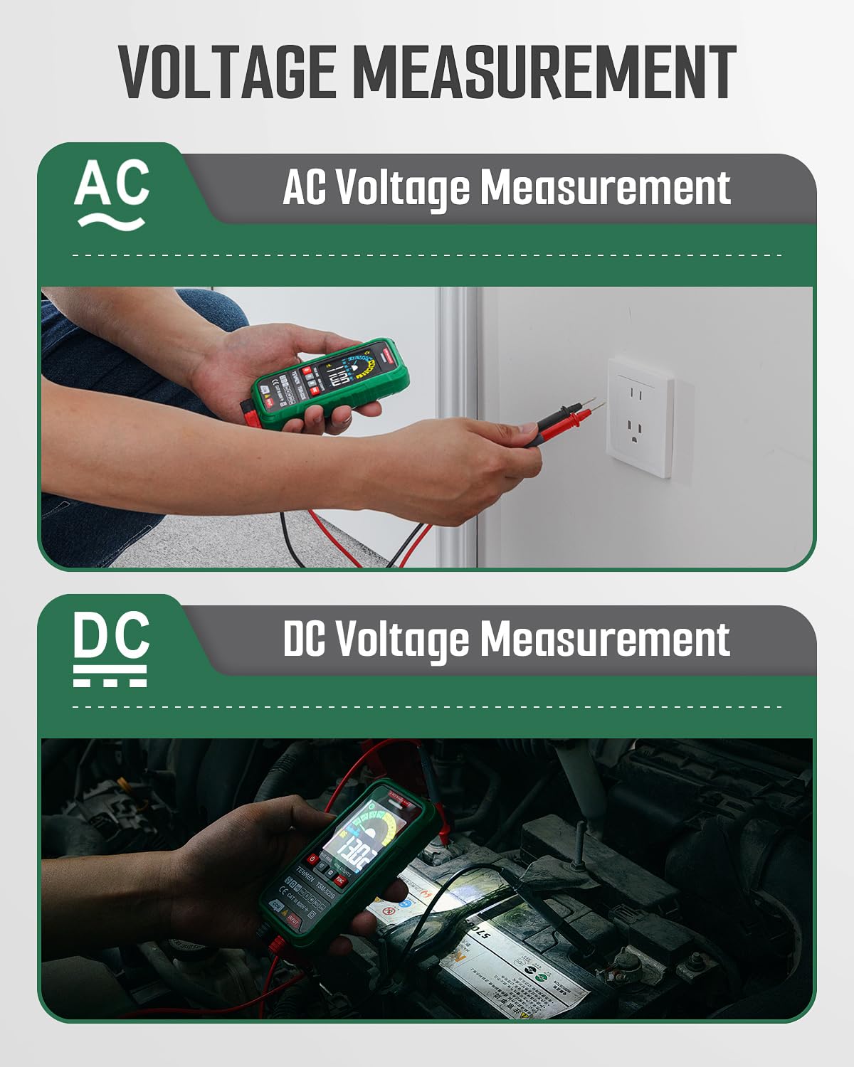 Multi-function: Accurately measure AC/DC voltage, resistance, continuity, frequency, diode, capacitance, non-contact voltage test and live wire. This voltmeter can be applied to automotive electronics, household appliances, electrician testing, etc. Simple and easy to use, enough to meet your changing measurement environments and complex measurement needs