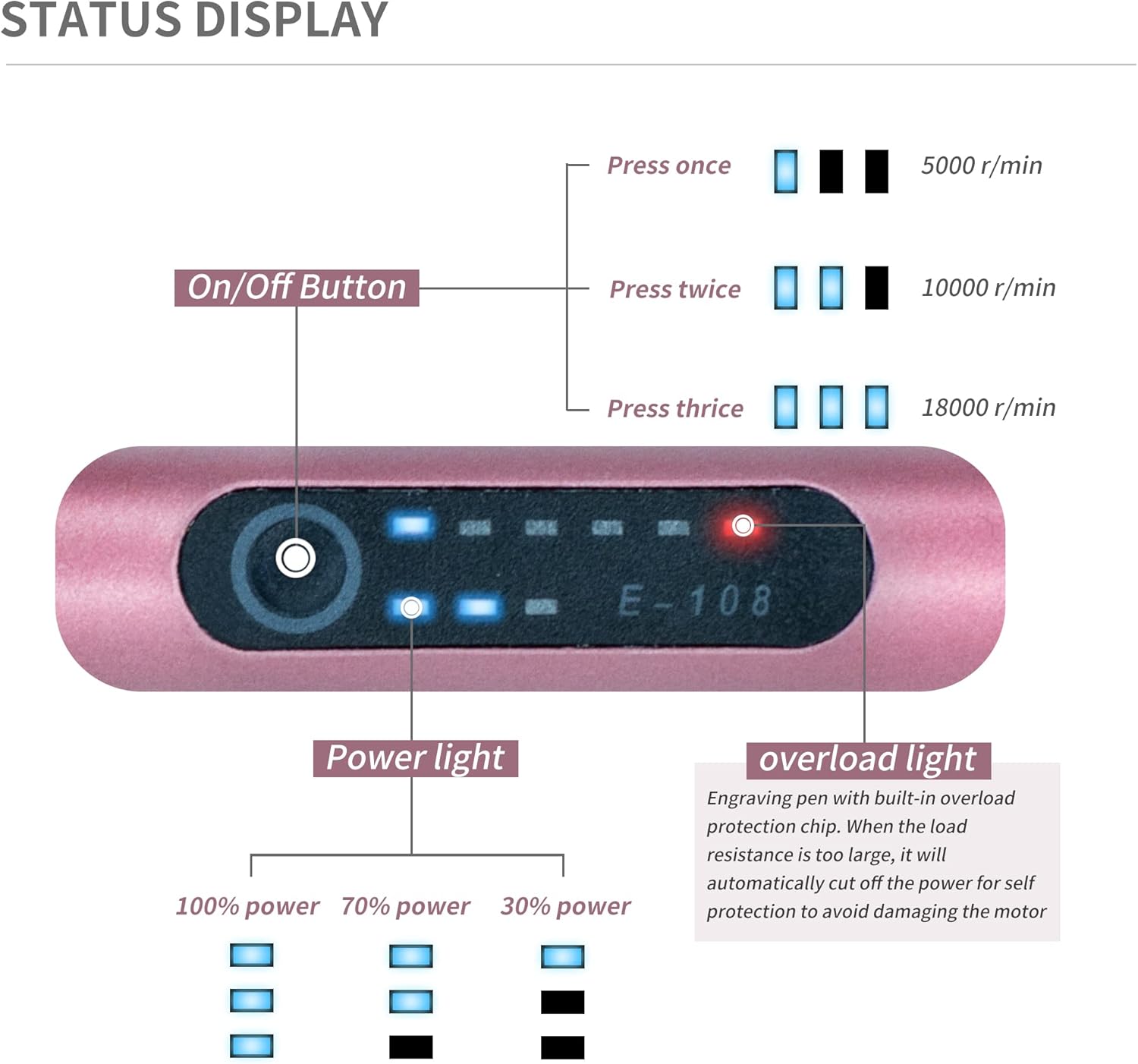 ★【ONE BUTTON TO ADJUST】It is convenient that speeds be changed just need one button. There are 3 gears with speeds of 5000-10000-18000 r/min. The speed of the engraving pen can be adjusted according to the needs of carving. Generally, fast speed for glass or ceramic, low speed for metal or wood.