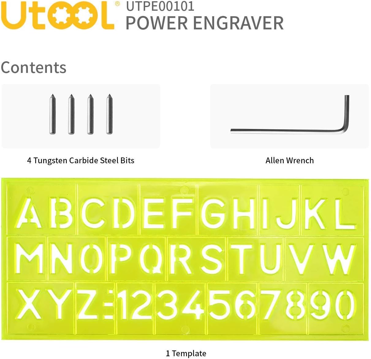 đ§ăComplete Engraver Set ă Perfect wood metal glass engraver for DIYers 5 variable depthspeed 4 tungsten carbide bits with soft rubber grip, high power 15W and 7200 strokes per minute letter/number template helps etch words and numbers.