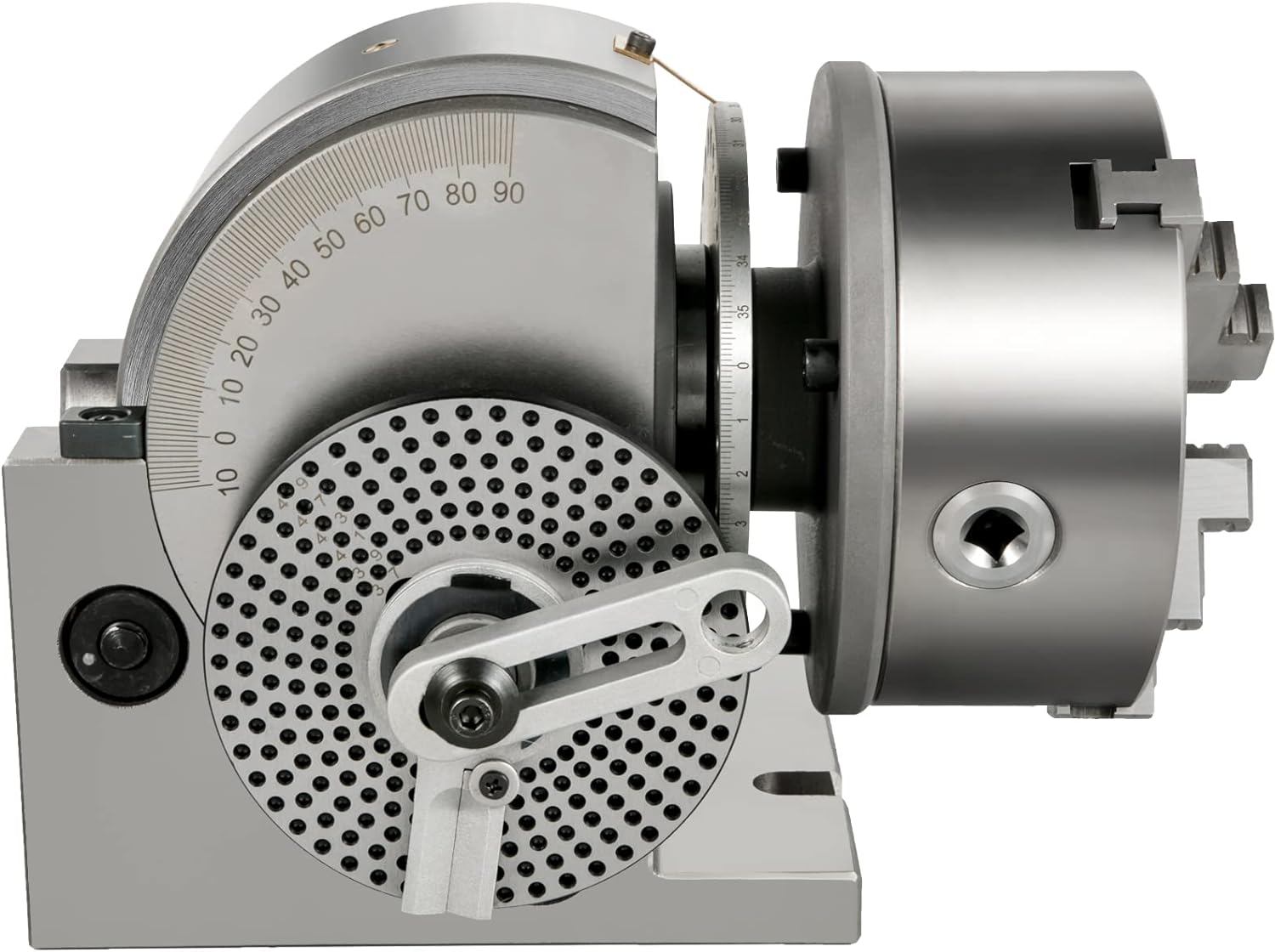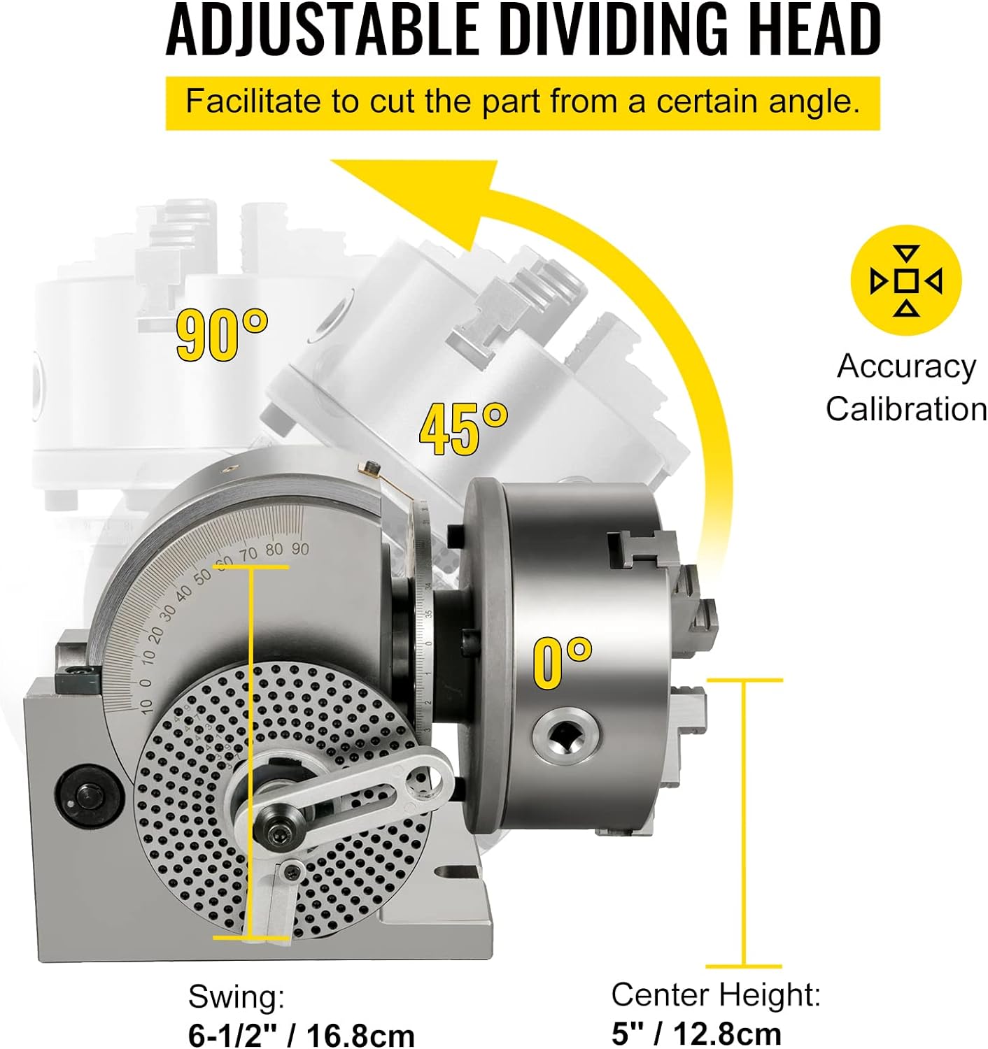 【Adjustable Angle】- The semi universal dividing head features 6″ 3-jaw chuck, Spindle Speed: 2500Rpm. Headstock adjustable from the horizontal position to 90 degree upward. Swing: 6-1/2″/168mm, Center Height: 5″/128mm. Free 3 more jaws for 6″ chuck.
