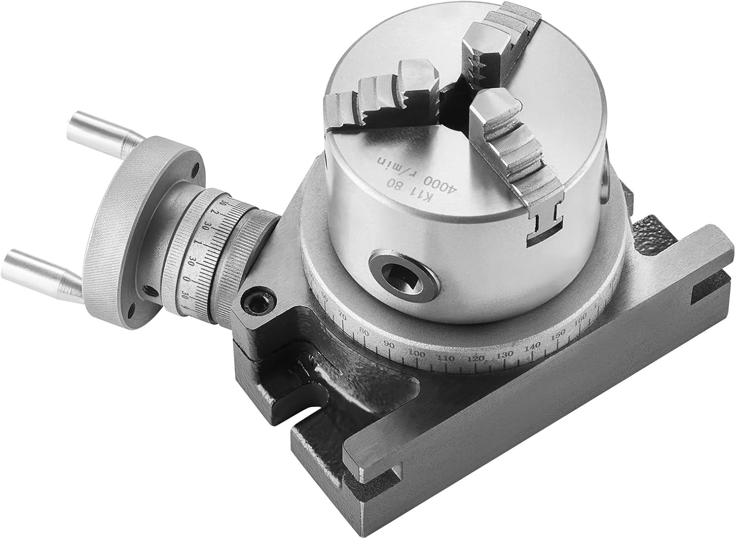Horizontal & Vertical Installation: When mounted horizontally, the chuck top height is 4.7” / 120 mm (±3 mm), and when mounted vertically, the chuck center height is 3.4” / 86 mm (±3 mm). Our rotary table fits industrial and home-use milling machines as long as your milling machine tool height is higher than vertical/horizontal installation heights. Additionally, the table’s bottom features positioning slots for easy and secure attachment to your milling machine.