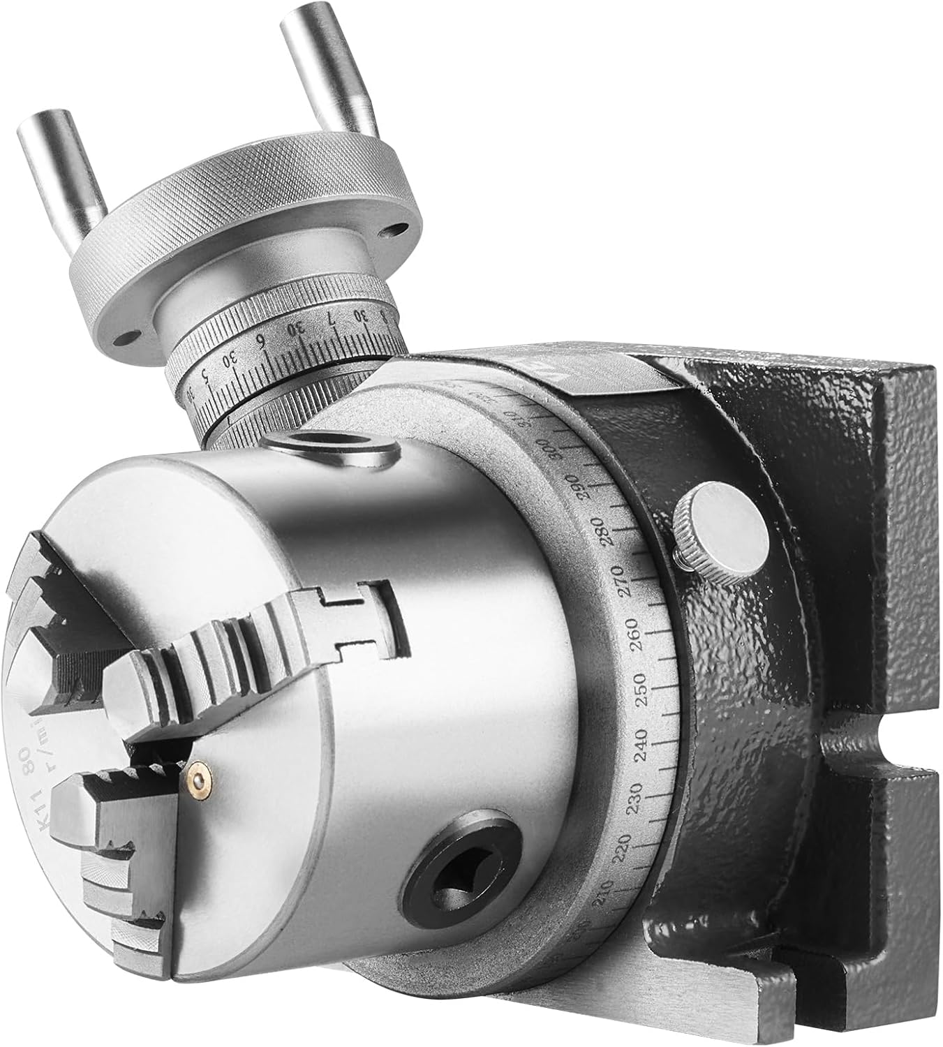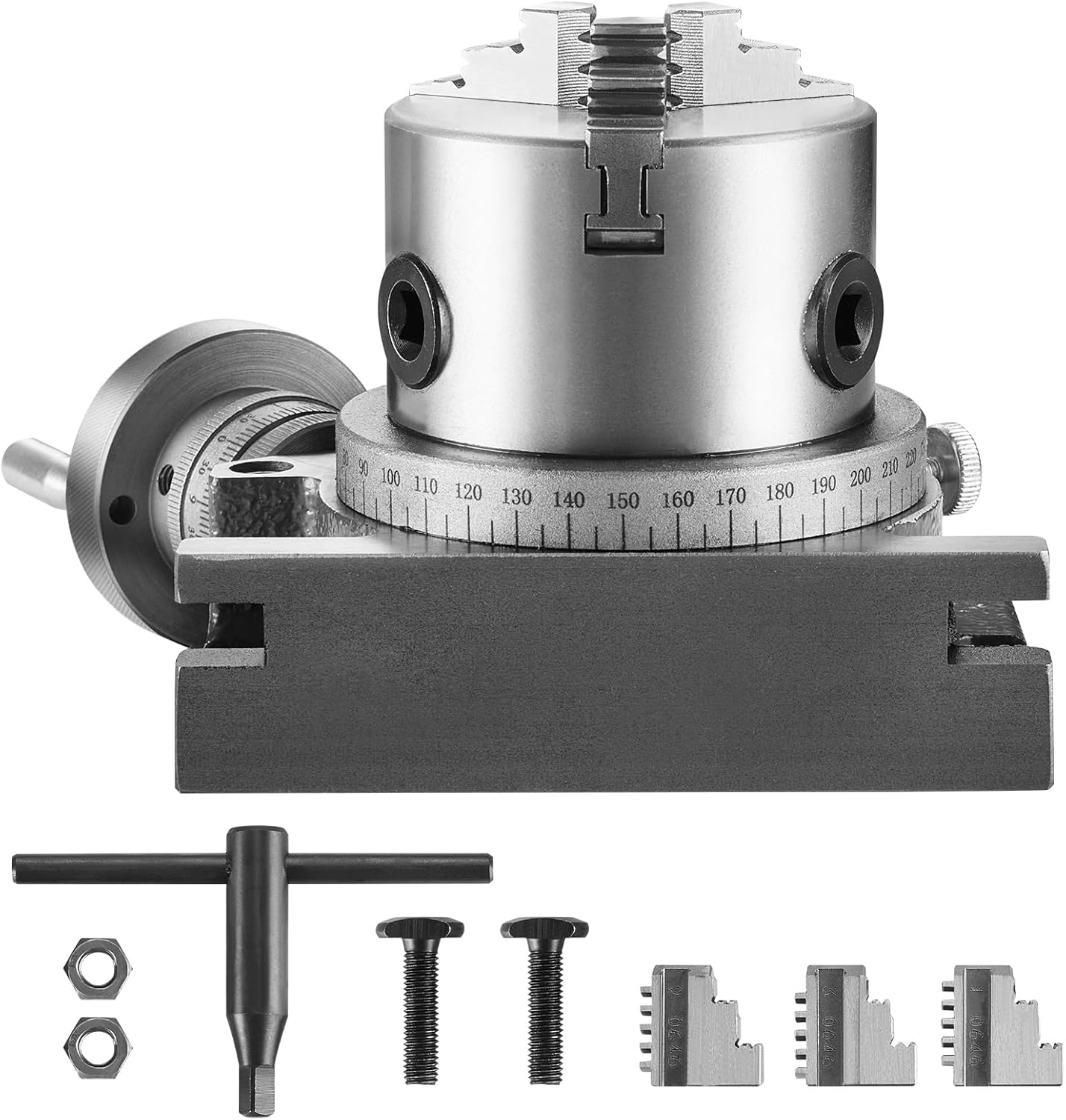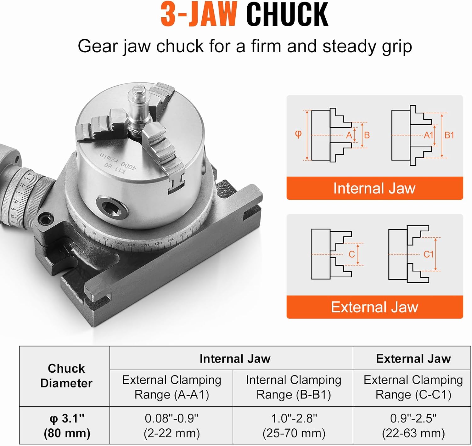 Secure Small Workpieces with Ease: Our rotary table comes with a 3-jaw chuck, and the serrated jaw ensures a firm grip on even the small workpieces. Chuck Diameter: φ 3.1” / 80 mm. The internal jaw can be used for internal & external clamping. External Clamping Range: 0.08”- 0.98” / 2-25 mm, Internal Clamping Range: 0.98”- 2.76”/ 25-70 mm. It includes an external jaw and external clamping range of 0.87”-2.76” / 22-70 mm. Enjoy the precise and secure machining of small components!