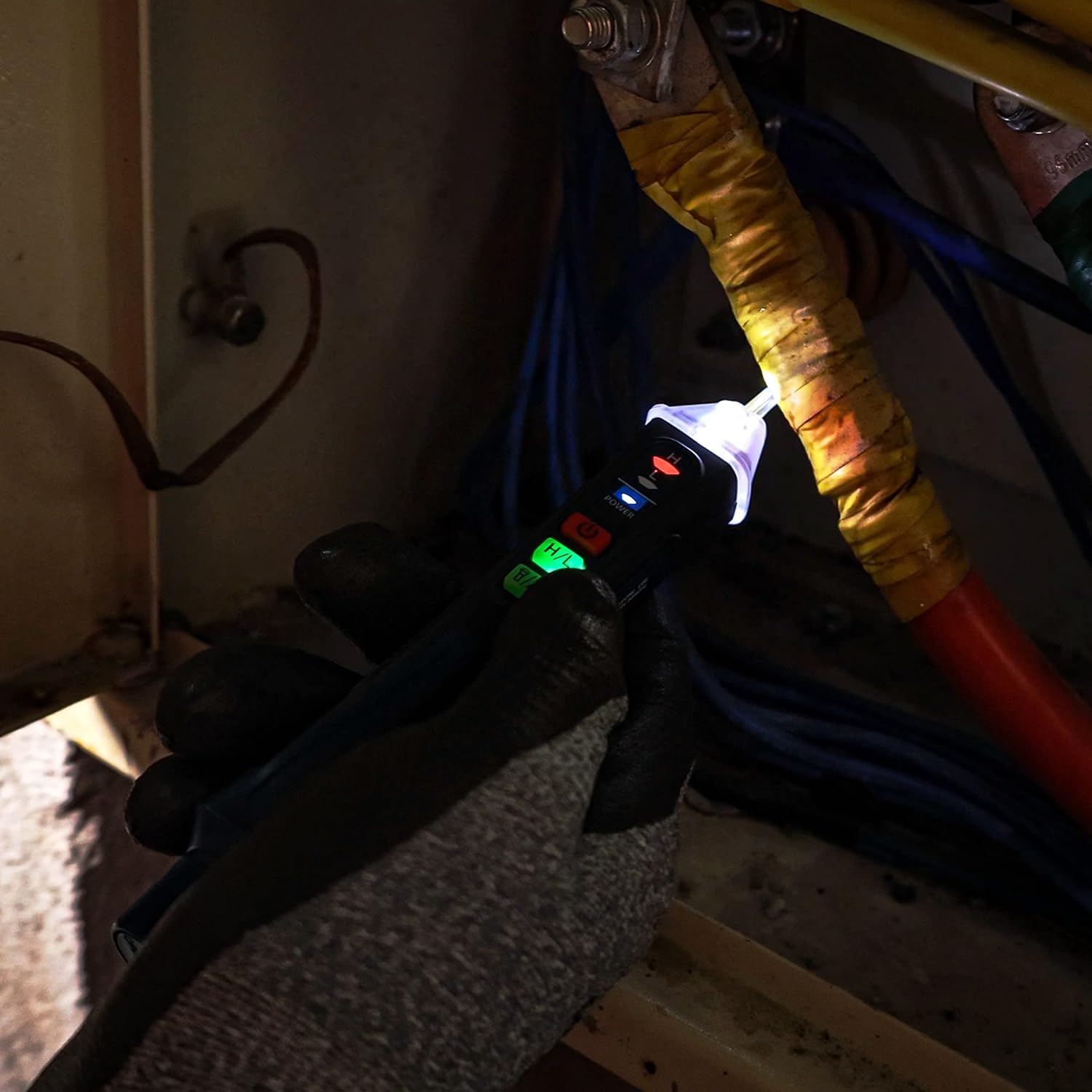 【Visible&Audible Alarm】The tip glows in red and beeper sounds at high frequency when high voltage is detected while yellow light and low frequency beep indicate low voltage.