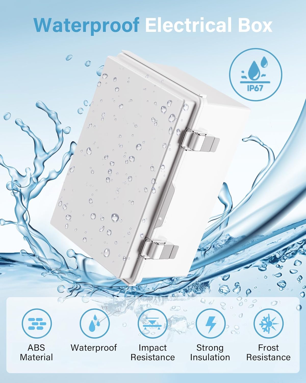 IP67 WATERPROOF: Strengthened rubber gasket,steel latches and ABS enclosure can tightly prevents water, snow,sunlight, dust etc. So this weatherproof electrical box works well in various indoor or outdoor places, moisty or 1 meter deep underwater environments.