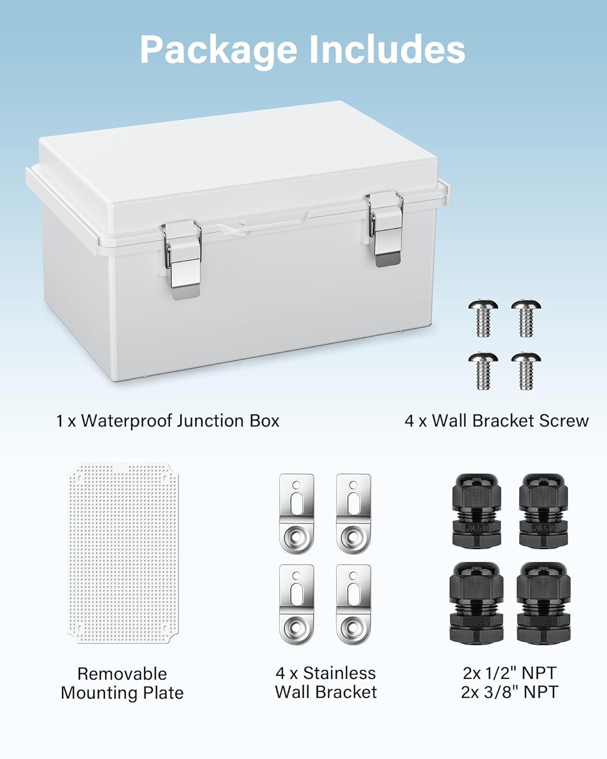 EASY DRILLING & INSTALLATION: This electrical enclosure is designed to be freely and easily drilled without cracking or deforming. Two 3/8″ NPT cable glands and two 1/2″ NPT cable glands are provided to protect your wires after drilling. Equipped 4 steel wall mounts are handy for convenient installation.