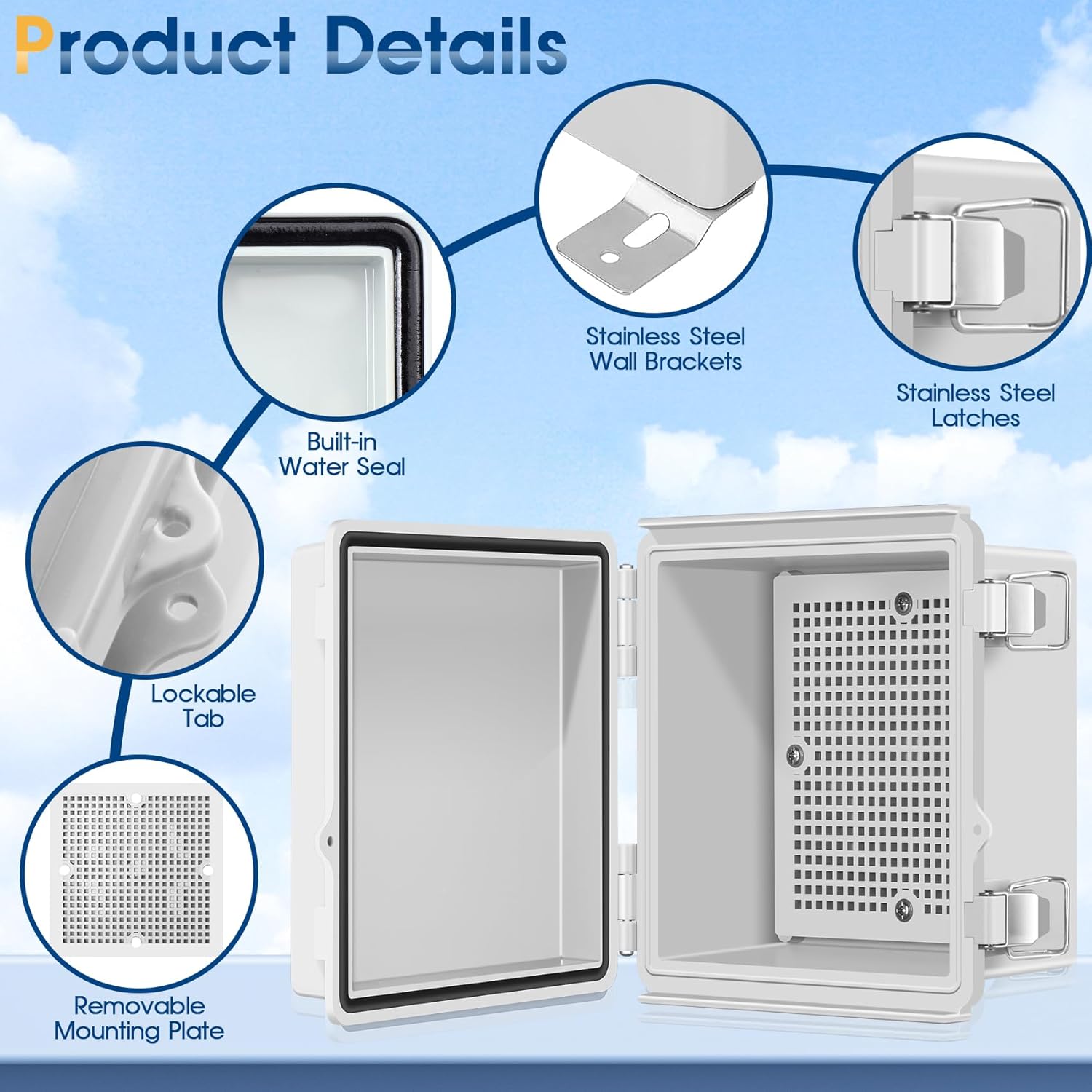 【Convenient Accessibility】Our project boxes feature a hinged cover, providing easy access for maintenance and operation. The stainless steel latches ensure a secure and watertight seal, safeguarding your electrical connections from water, dust, and other elements. It offers reliable protection for both indoor and outdoor installations.