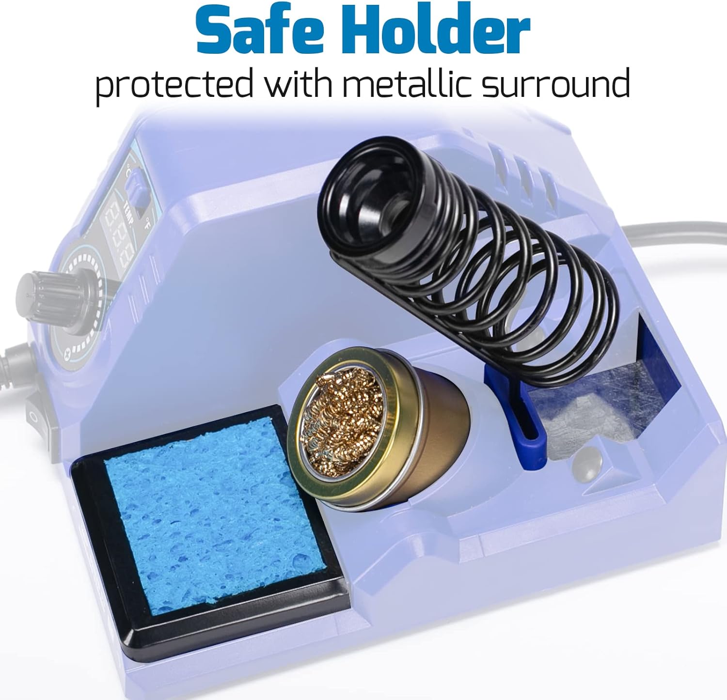 Takes minimum desk space, never lose your holder again, made from highly temperature resistant materials, surrounding protected with metallic parts to prevent damages by accidental solder splashes.