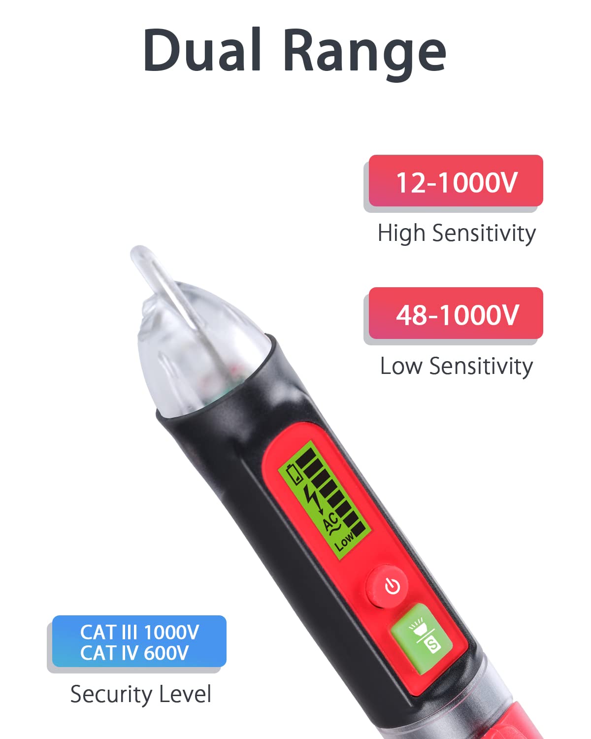Dual Range (12 -1000 V/48V- 1000V): Press the S button to adjust sensitivity can choose according to your needs to detect voltage on AC electric throughout the home: outlets, cords, switches, circuit breaker, power strip, etc. The NCV sensor automatically recognizes the voltage and displays it on the bar graph.