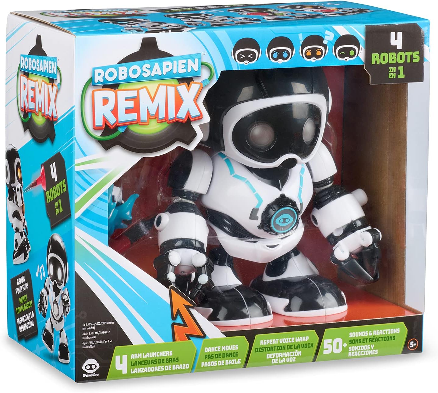 Meet Robosapien Remix! He’s 4 robots in 1 and mixes them up for fun so you never know who you’re going to get! Remix likes to change his mind all the time! Whether he’s an Excited Robot (White LED), Silly Robot (Green LED), Serious Robot (Blue LED), or Confused Robot (Orange LED), Remix keeps you entertained with 50+ sounds and reactions. Tap, shake, and push his buttons to see what makes him tick! And he has a few tricks up his sleeve! Remix packs a punch with 4 Swappable Arm Launchers including his Claw, Mega Fist, Boxing Glove and Plunger. When he’s not standing guard, he boogies to his own beats! Watch him shuffle, shimmy, and step to show off his Remix Dance Moves. Then get ready to giggle! With Remix’s Repeat Voice Warp, make him say anything for big laughs or hilarious pranks! Inspired by the best-selling Robosapien robot toys from WowWee, he’s a robot reboot, remixed for a new generation! Requires 4 AAA batteries (not included). For boys and girls ages 5 and older.