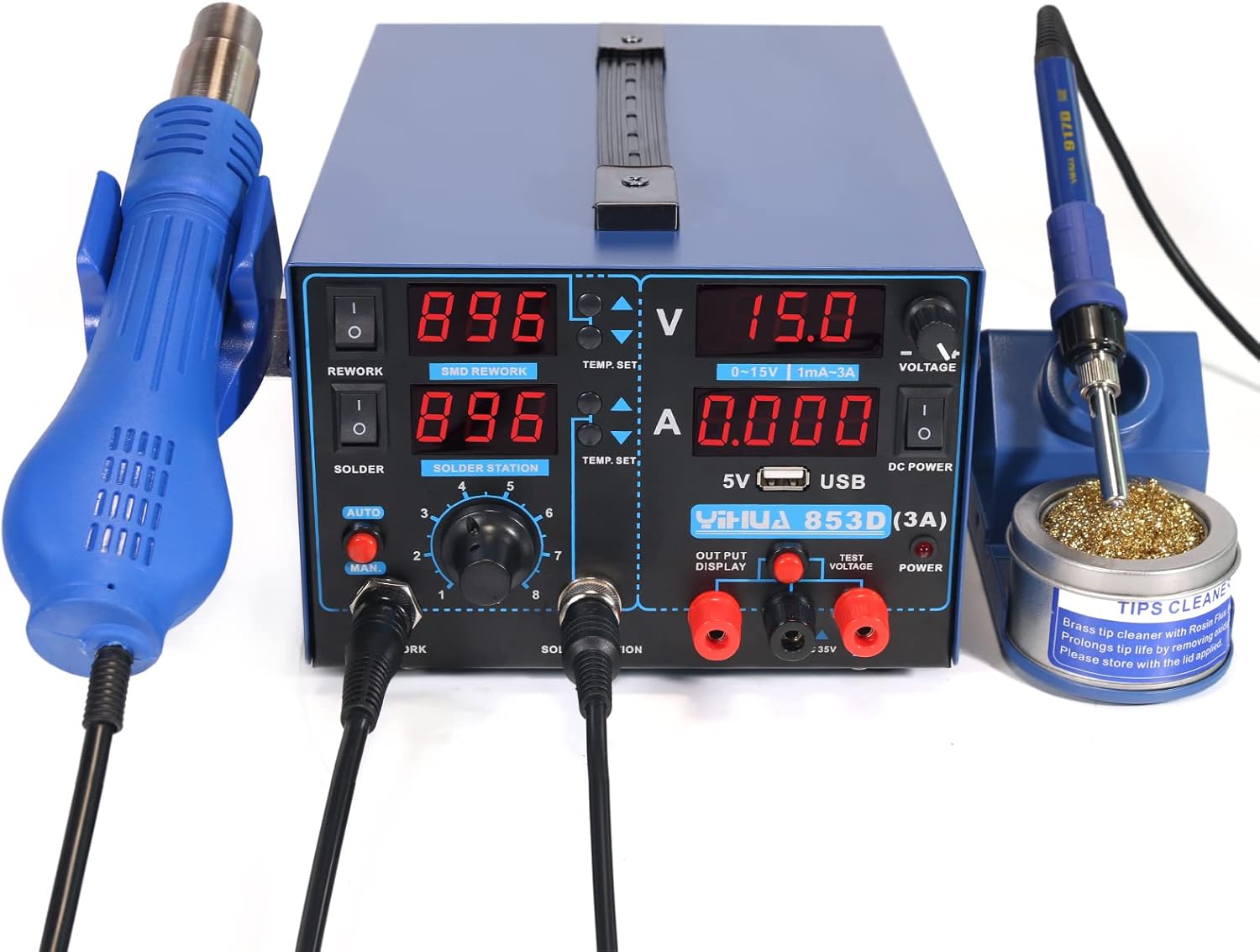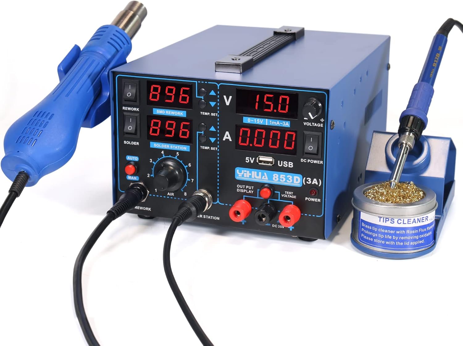 1 = 3 – You now get three professionally integrated stations in one compact package. The 853D Series comes equipped with a soldering iron station, a hot air rework station, and a power supply testing station.