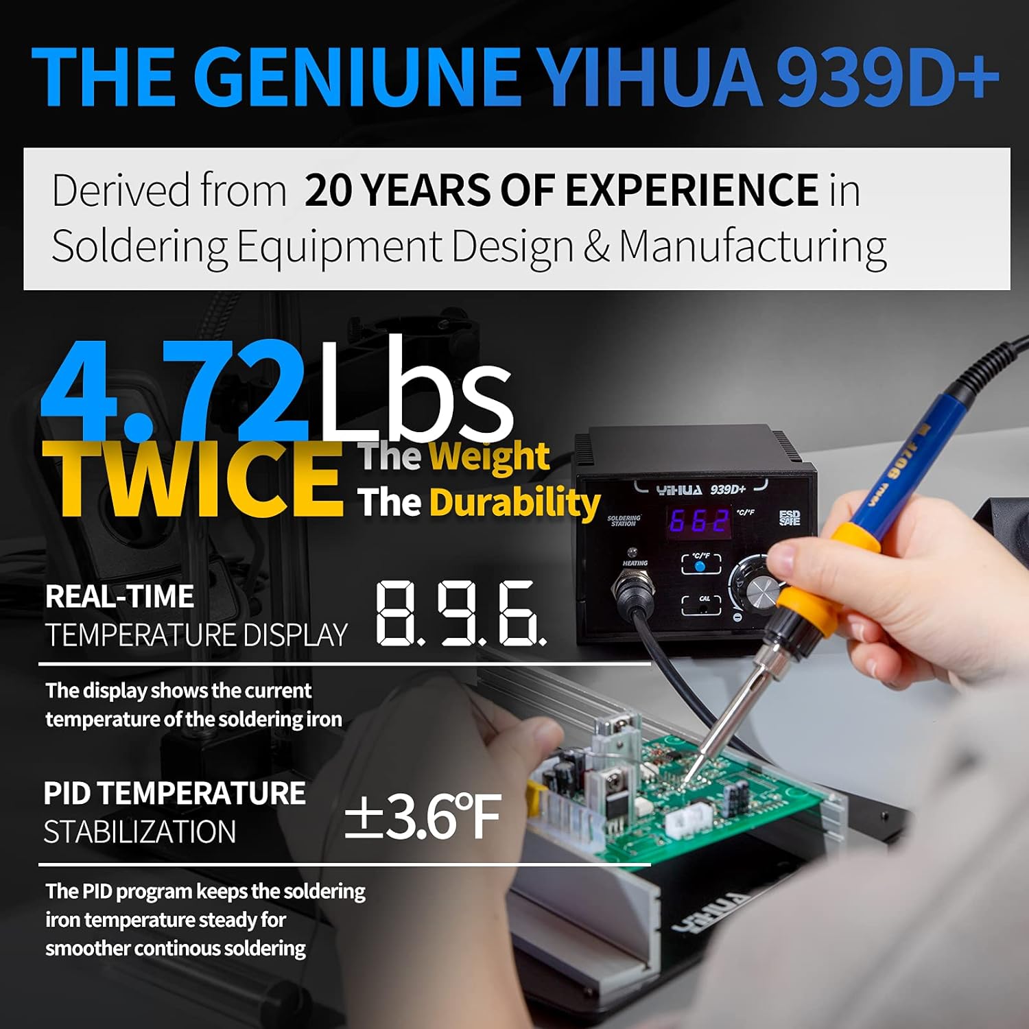 Solidly-Built Powerful Soldering Station: the YIHUA 939D+ Soldering System is made for those who solder regularly. It’s so reliable that even industrial-level factories use this soldering station for over 10 hours every day for manufacturing. This station comes with high power performance, flexible temperature from 392°F to 896°F, faster heating up, enhanced temperature stabilization and enhanced performance. Get your soldering projects DONE with this capable & reliable 939D+ system!