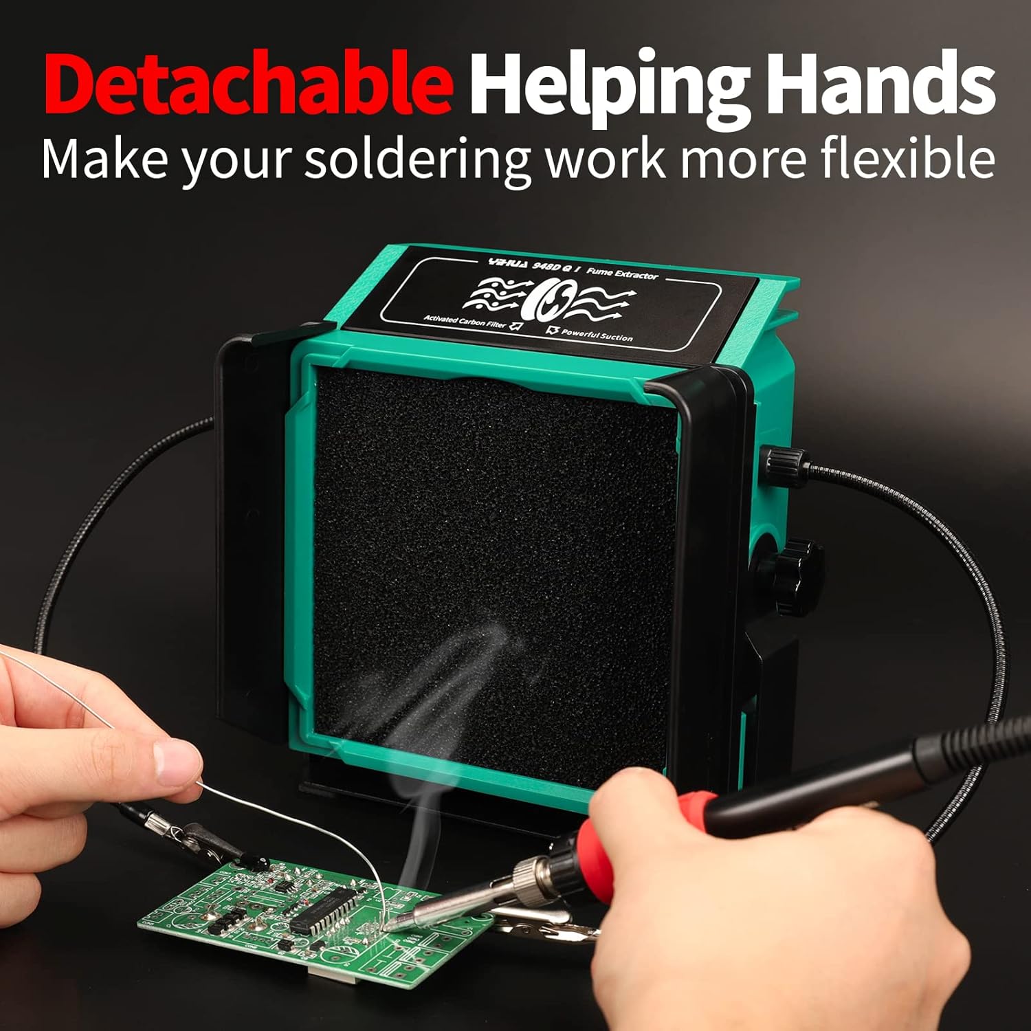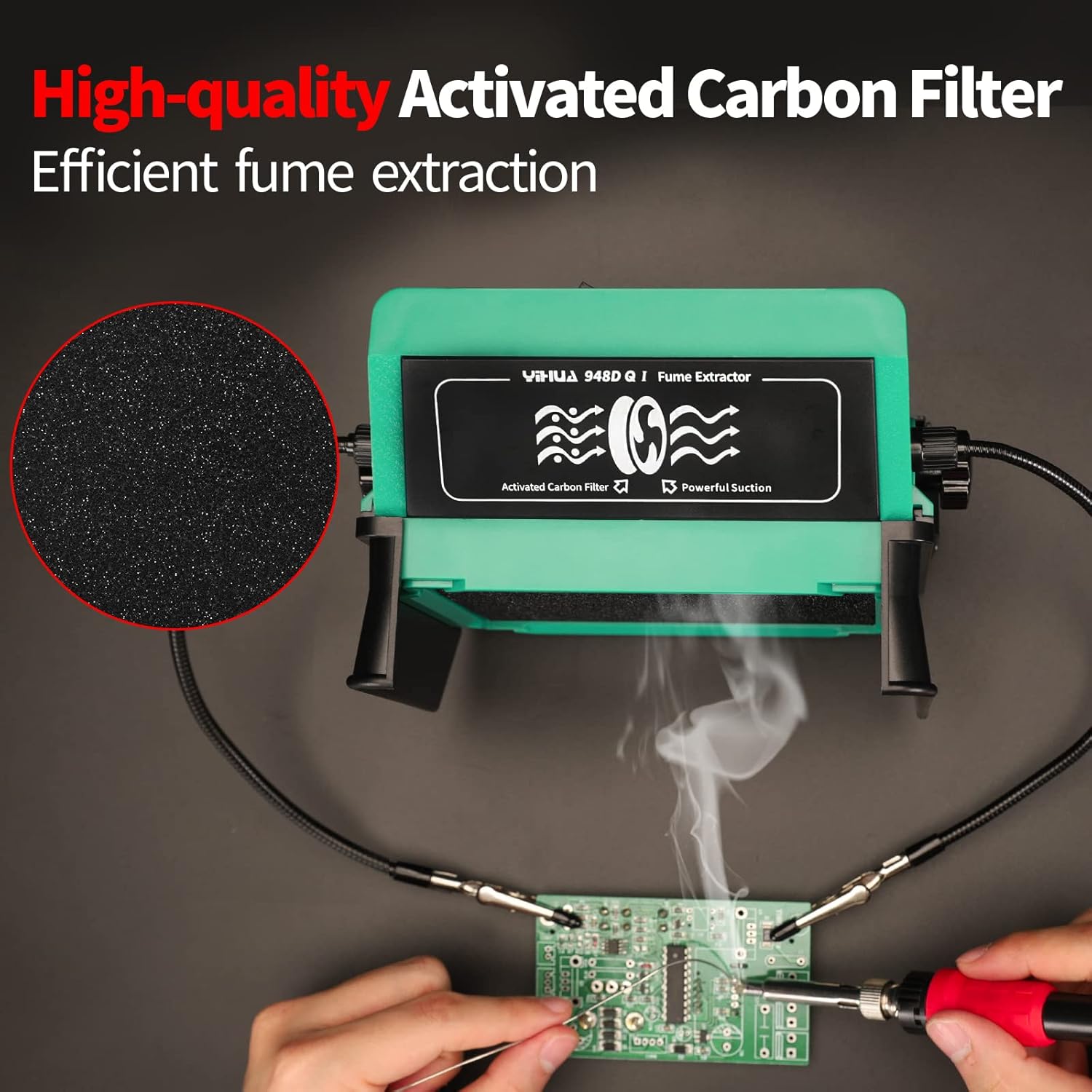 Essential Information – YIHUA 948DQ-I comes with 8 carbon filters, 2 fenders and 1 tiltable stand for the Solder fume extractor and a pair of detachable helping hands. This product can adsorb harmful fumes generated from soldering, effectively cleansing the air in your workplace, ensuring safety and working efficiency.