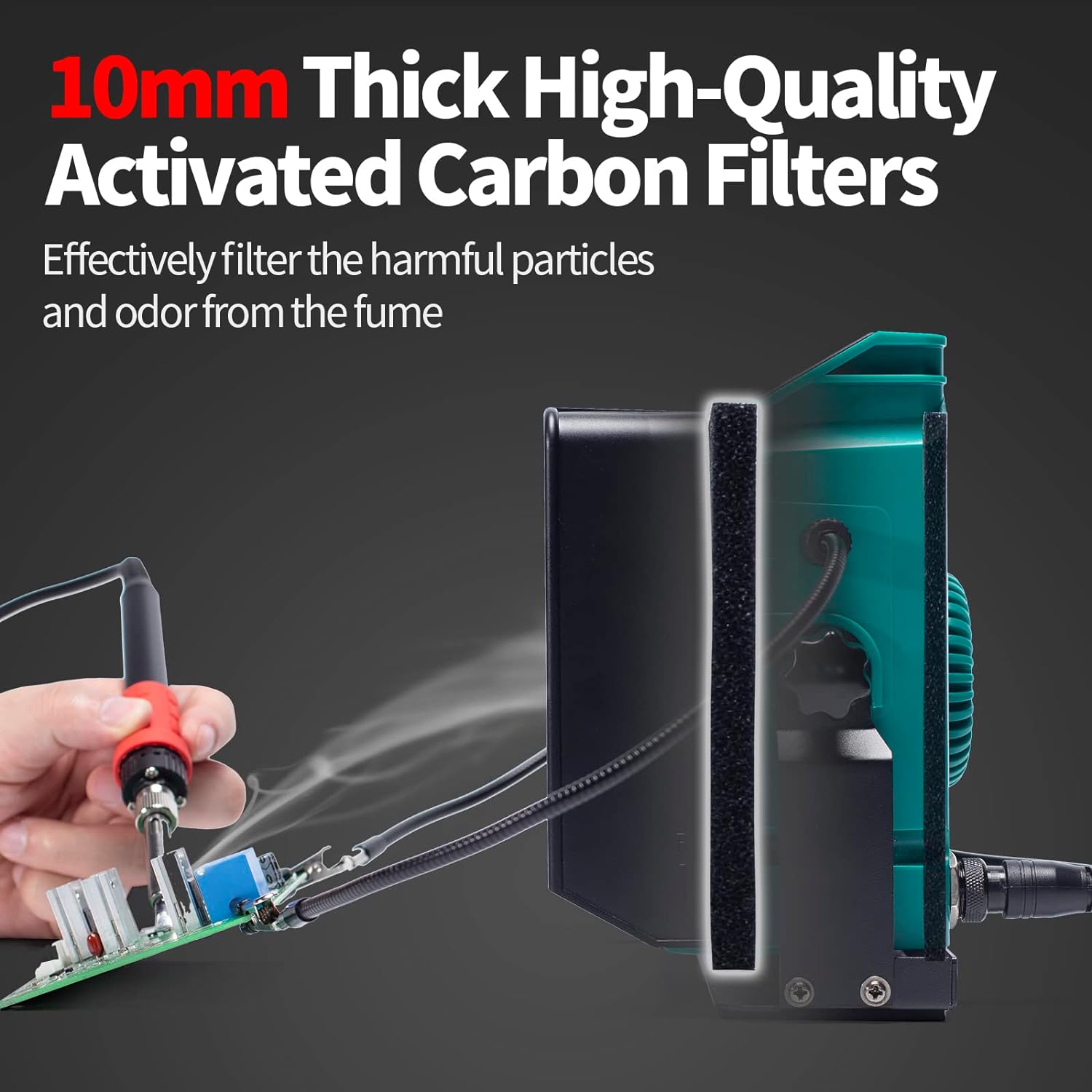 The fume extractor comes with double filtering, with activated carbon filters fitted in both the front and the rear of the unit. The stand‘s tilt angle is adjustable, and the unit comes with attachment points for helping hands. This smoke absorber can adsorb the harmful particles inside the fume generated from soldering, wood burning, and other types of crafting work.