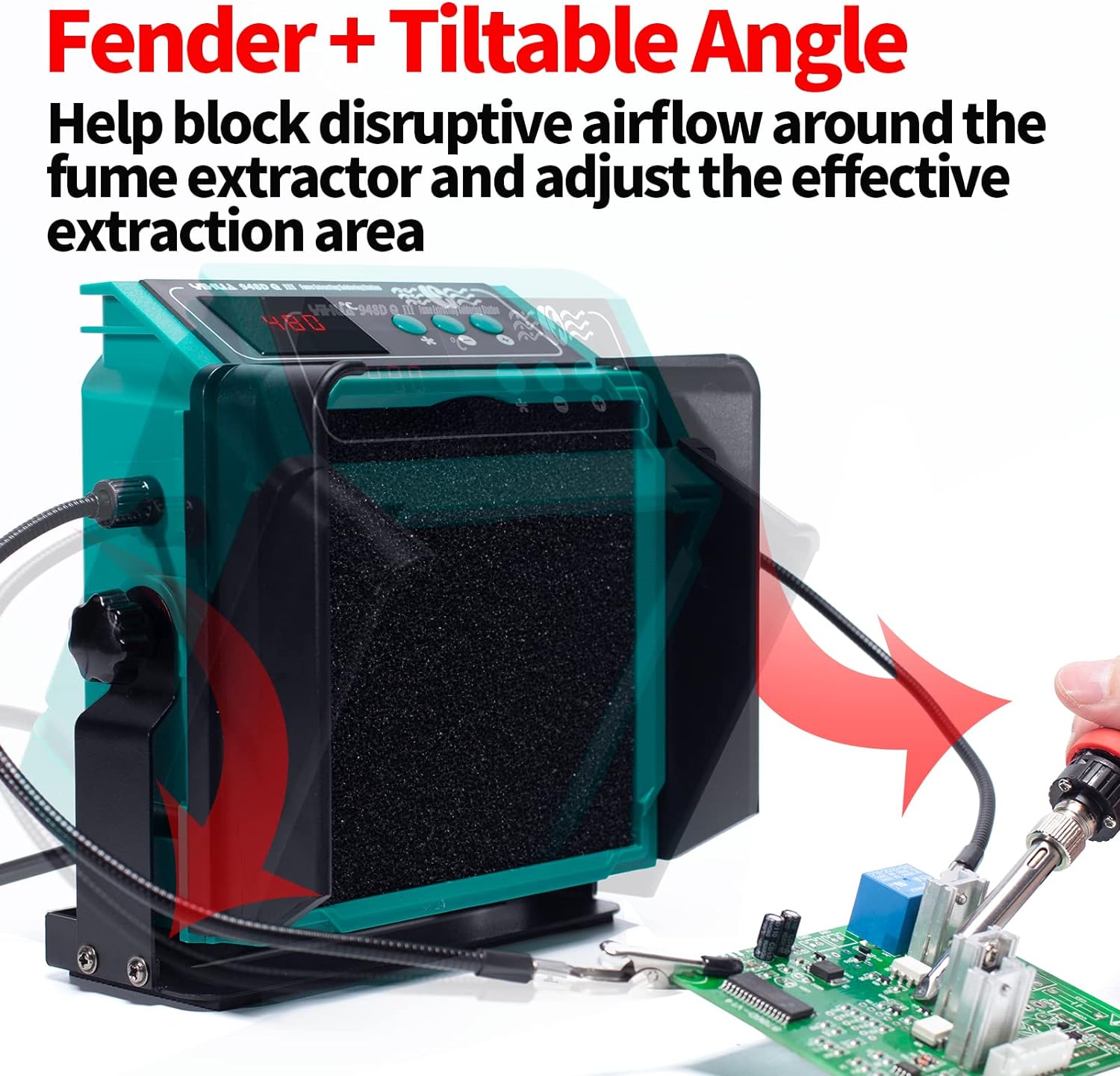 The unit’s fender design helps block disruptive airflow around the fume extractor and increases the effective fume extraction area. The fan can extract fumes generated within 10cm (3.9inches, ±10%) away from the fume extractor (effective distance measured directly from the front). The attachable helping hands (30cm,11.8 inches, ±10%) can help you secure the PCB, wires, or other objects when soldering, freeing your hand to focus on soldering.