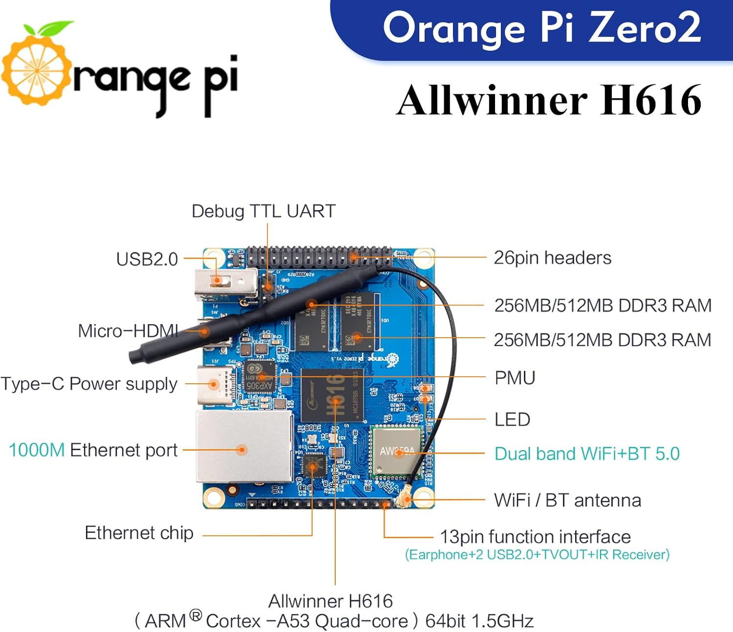 Orange Pi Zero 2 adopts Allwinner H616 64-bit high-performance quad-core Cortex-A53 processor, the sbc has 1GB DDR3 memory specifications, Support 1000MB Network, Run Android 10, Ubuntu, Debian OS Single Board.